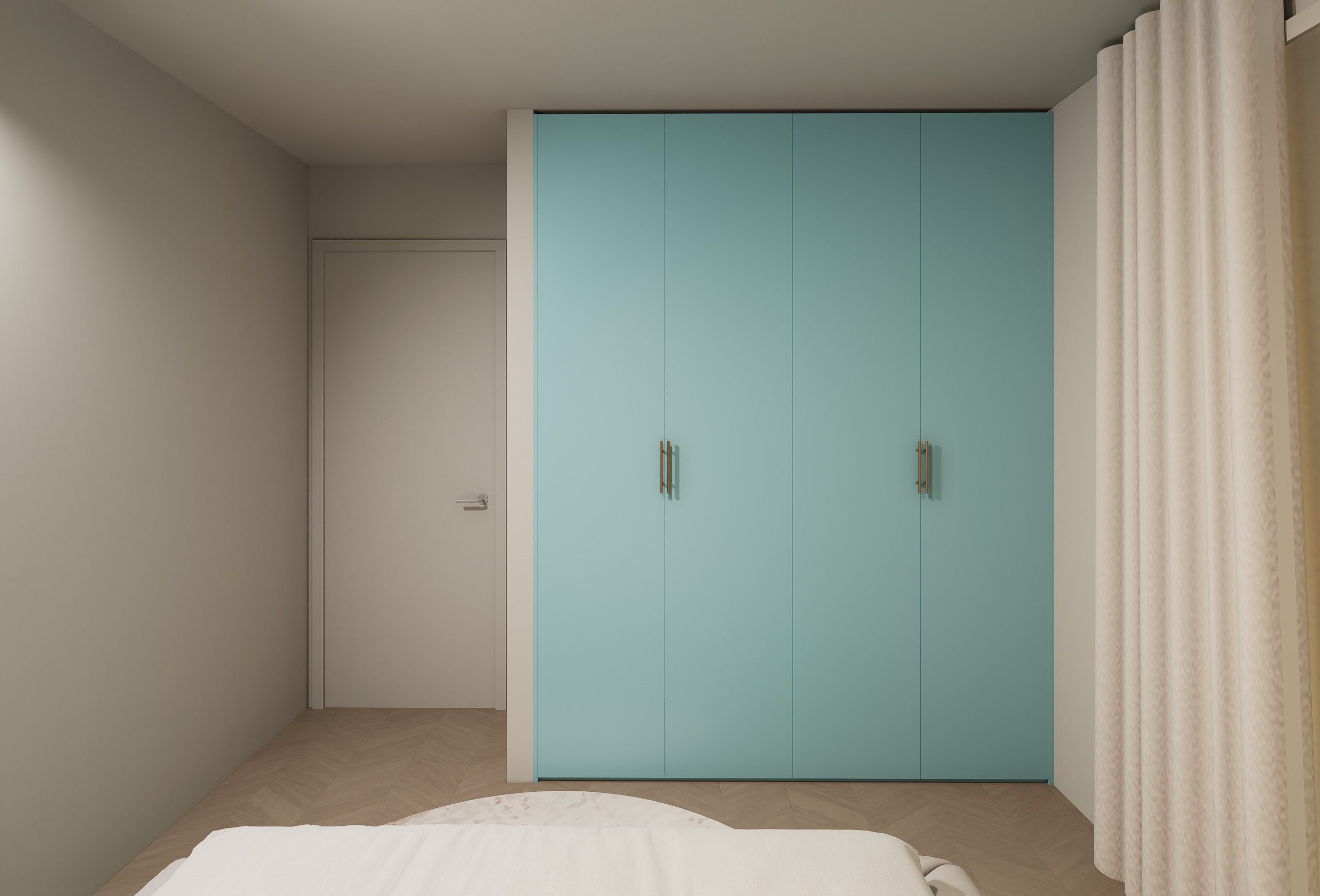 enhance this render into an ultra realistic high end wardrobe visualization while keeping everything exactly the same no changes to design layout proportions colors materials handles walls floor curtains or camera angle this is strictly a realism upgrade only material accuracy wardrobe panels muted turquoise soft blue green matte lacquer smooth and uniform finish matte no gloss soft light diffusion handles brushed brass warm metallic subtle reflections floor light oak herringbone natural grain variation curtains soft beige fabric realistic folds and texture walls door warm neutral matte paint enhance realism with subtle surface imperfections on matte lacquer very soft premium feel realistic light interaction on painted surfaces no shine refined wood grain on floor with natural variation soft fabric depth and folds on curtains clean contact shadows and ambient occlusion around edges accurate reflections on metal handles lighting keep exact same lighting direction and mood soft warm neutral interior lighting 3000k improve light falloff shadow softness and bounce light no change in exposure or composition rendering quality sharper detail realistic materials clean high end architectural photography look negative prompt do not change color do not change wardrobe design do not change handles do not change layout do not add elements do not change lighting setup no glossy finish no color shift no redesign no distortion no extra decor