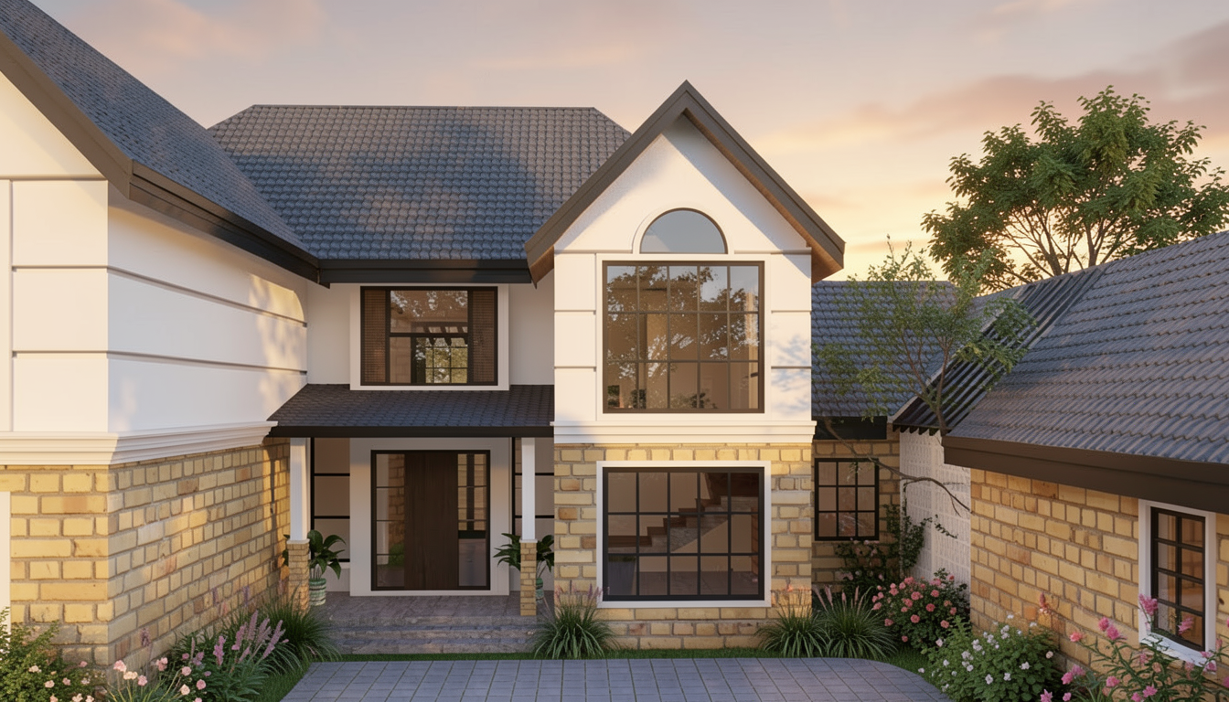 place in a suburban neighborhood with large driveway and sidewalk to front porch add seating and planters on front porch