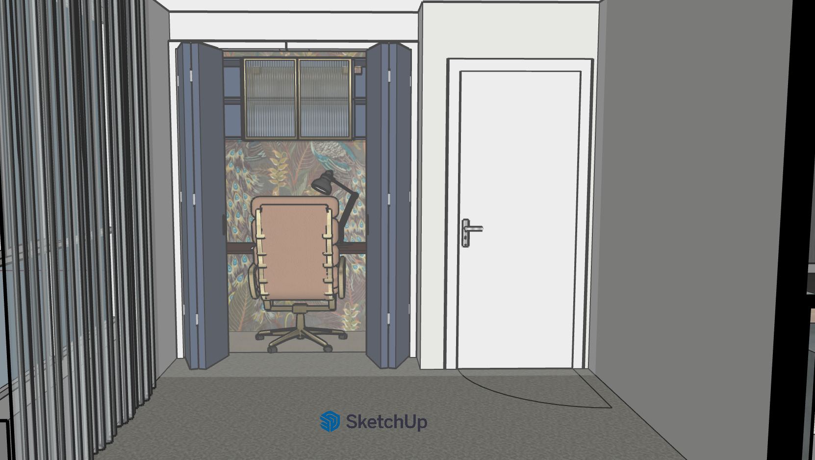 create a realistic render of this image for an interior design client add a simple ceiling add lighting sheer soft curtains soft grey beige carpet over the entire floor can you make the bed and cabinets either side of it in a walnut timber finish remove the text