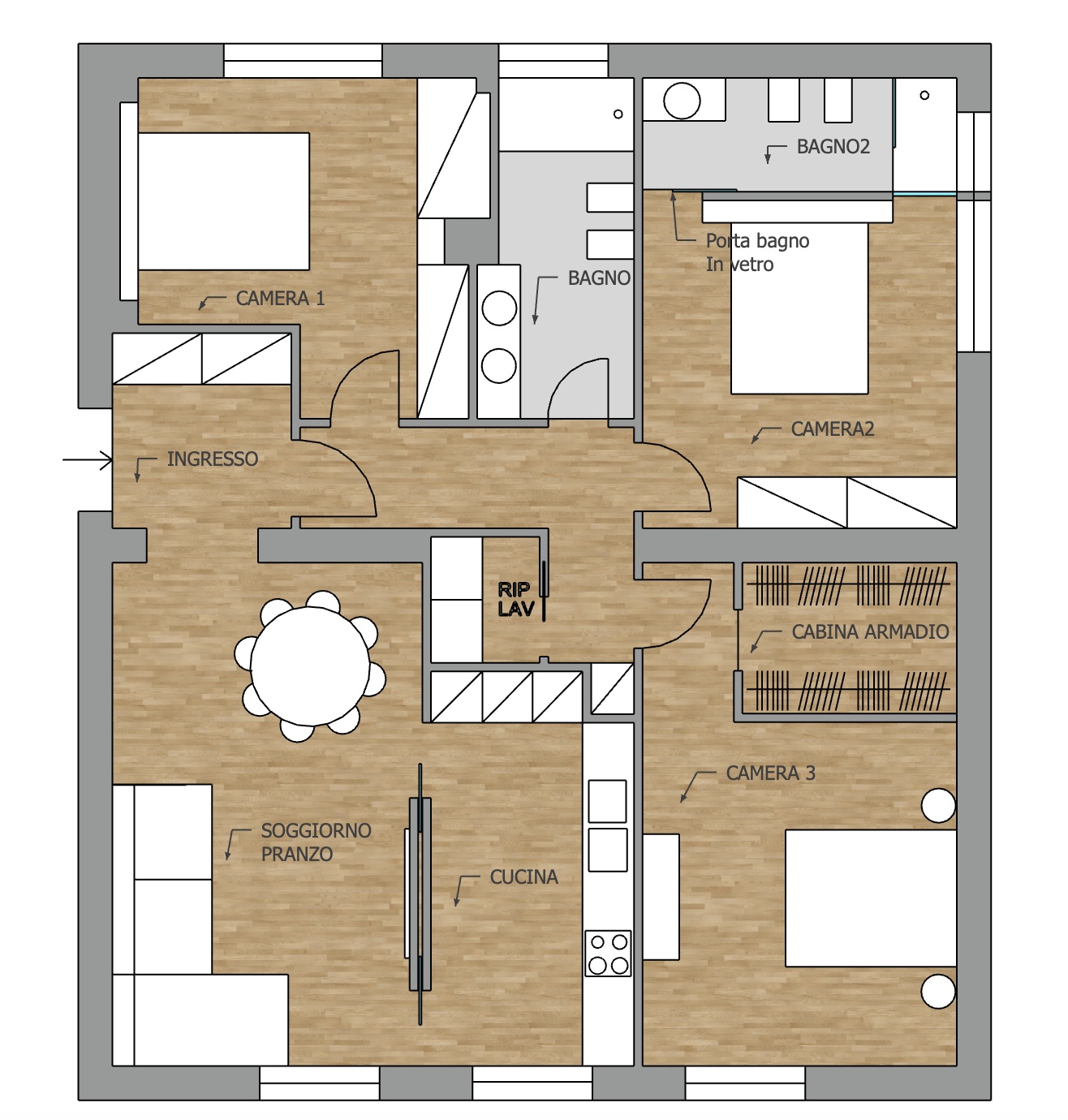 convert this floor plan into a realistic isometric 3d view of a full house show the space from an elevated angle with furniture walls and details visible scandinavian style warm lights use the same furniture as shows on the plan do not change the orientation of the floorplan