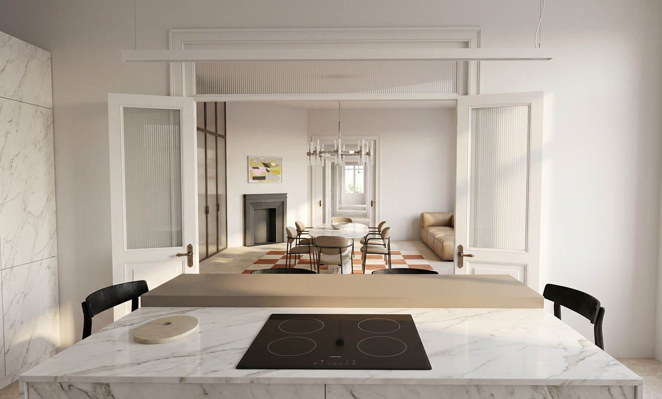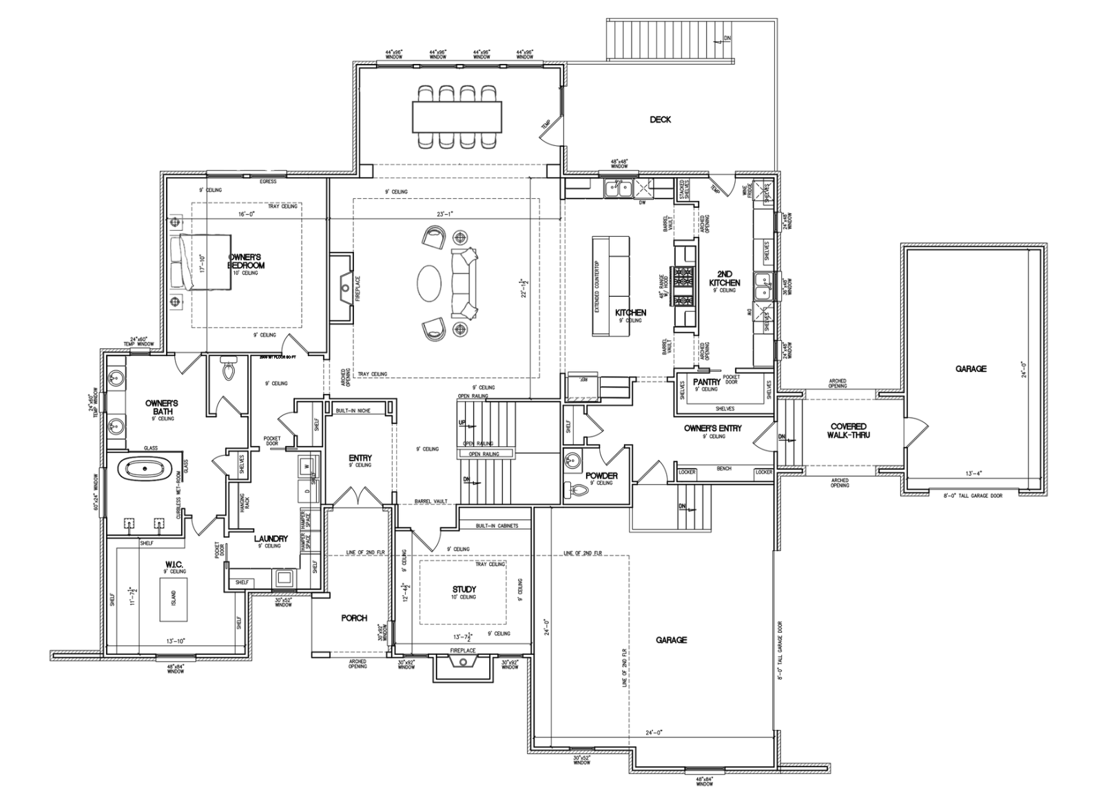 convert this floor plan into a realistic isometric 3d view of a full house show the space from an elevated angle with furniture walls and details visible make the 3d view very simplistic the flooring is to be a light white oak interior windows are white concrete floors in garage and back deck make all furniture an off white color use the same furniture as shows on the plan do not change the orientation of the floorplan