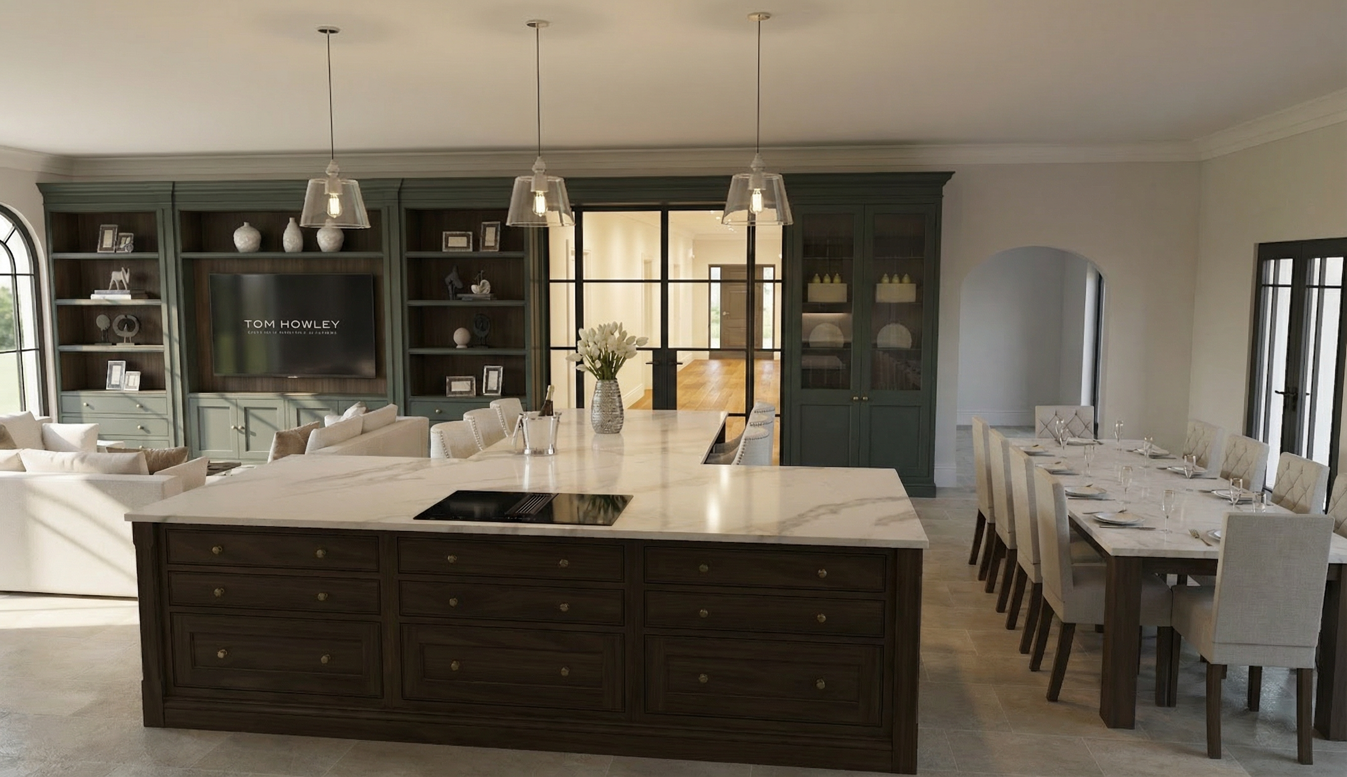 show with crittal doors between the cabinets with a hallway behind the glazed doors on the left hand set and right hand set of doors please add arched glass to the patio doors in white and make as lifelike as possible and a more modern luxury sofa in white show a playroom through the arch on the back wall