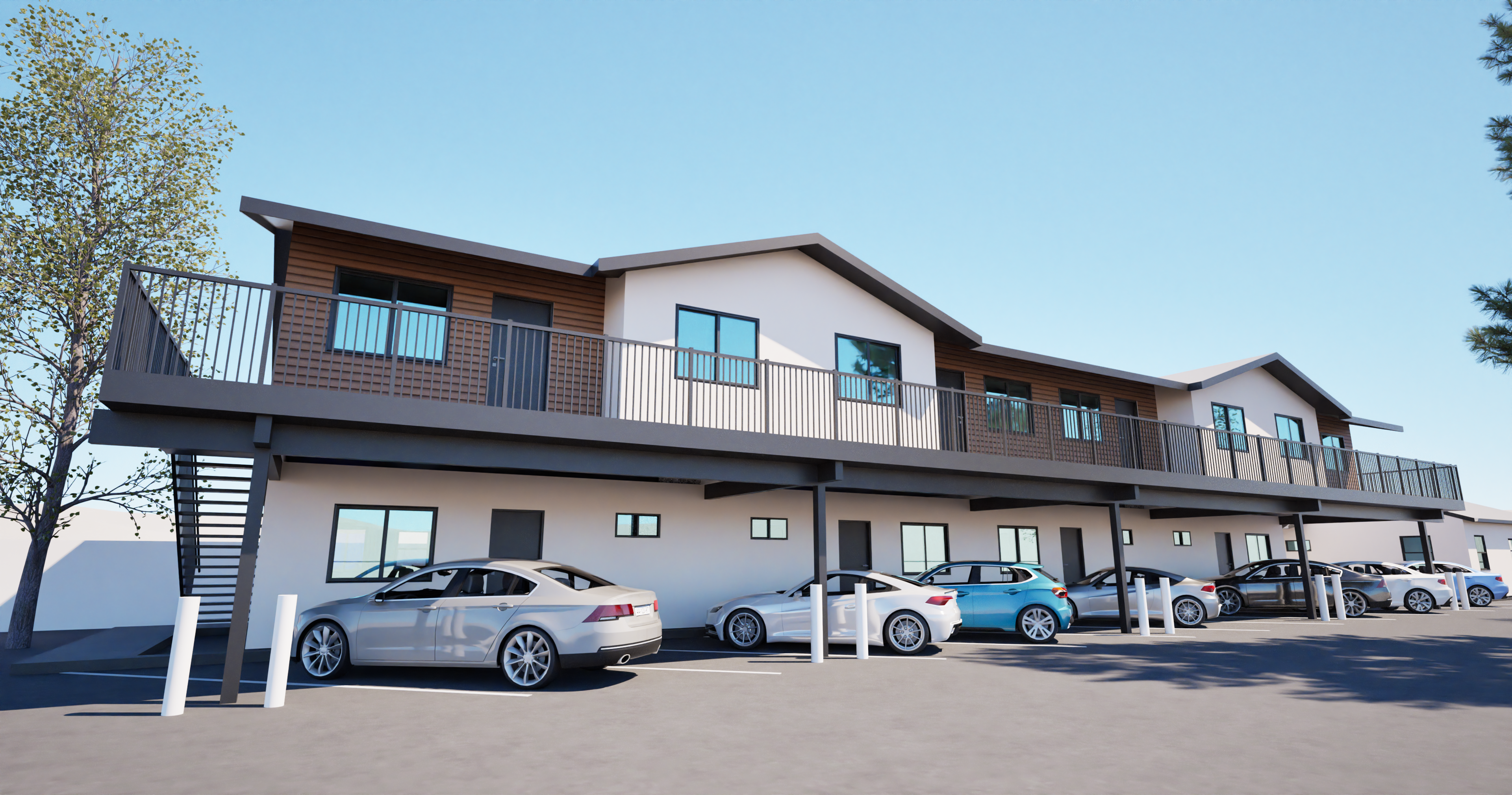 convert to realistic photo with apartments in the background ans california native trees in sinrise setting