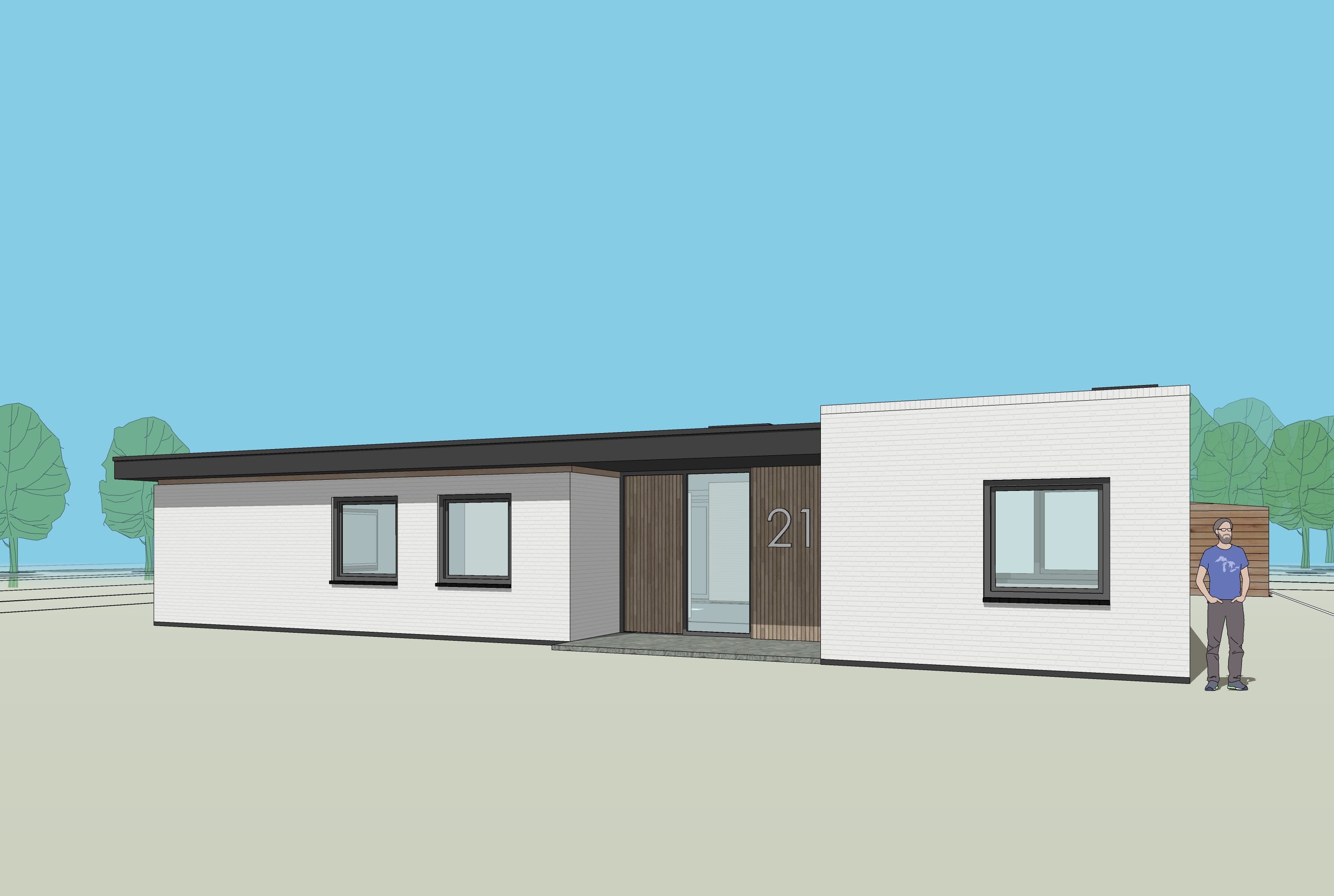 make it a sunny day with gras in the front a path to the frontdoor people in the front and lots of trees forest in the background