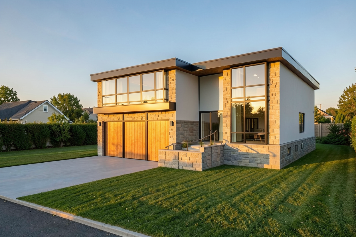a modern two story house with large glass windows the exterior walls are a precast stone complemented by a rich white stucco above and by a flat black aluminum roof the driveway and pathway are made of smooth gray concrete cedar garage doors the surrounding lawn is lush vibrant green and well manicured the atmosphere is serene and ambient capturing the house bathed in warm golden sunlight with a clear blue sky overhead