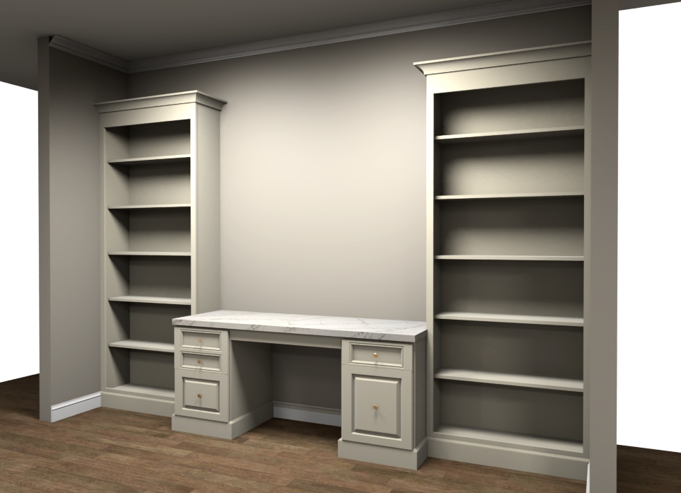 create a hyper realistic photo from this built in desk renderings add books and decor to the bookcases and a chair underneath the desk
