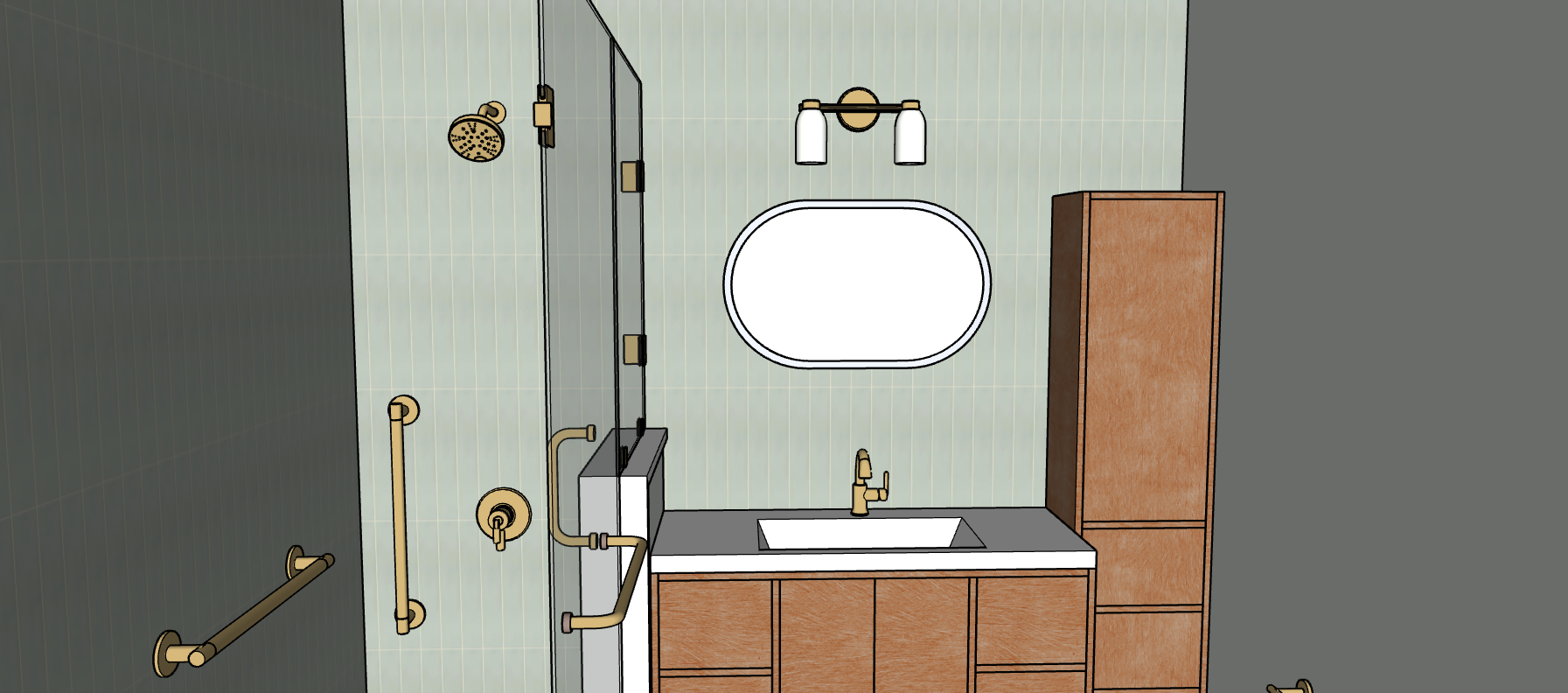 tile has a mint color with with tone variations lighting comes only from the vanity light with semi transparent scones 3500k and mirror backlighting the mirror has a soft white backlit halo 3500k evenly diffused there is no sunlight nor any light source other than the vanity light and backlit mirror overall scene is evenly brightened using neutral 3500k lighting only do not add highlights glow reflections or new light sources wall tiles have small mint tone variations for for distinction