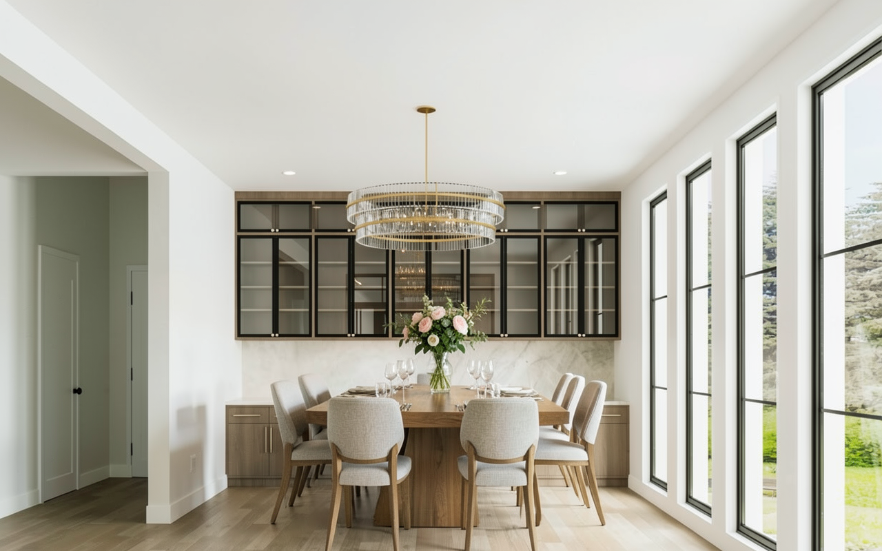 do not change thee design at all just you add a 12 foot rectangular dining table make it rustic wood and modern rounded chairs make sure the table is further away from the cabinets about center to the room make it run parallel to the windows