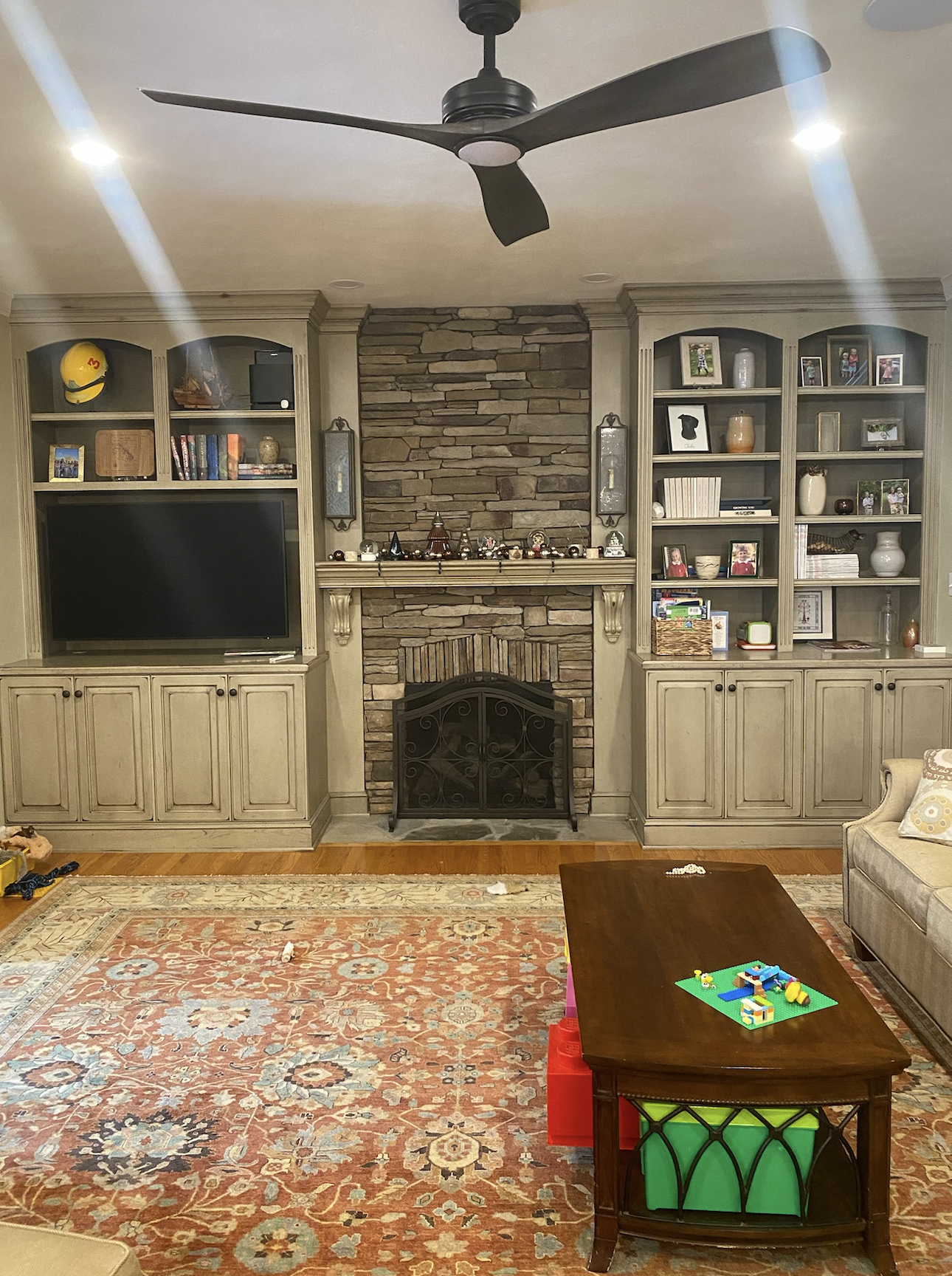 please cover stone around fireplace with dry wall and add art work and sconces above