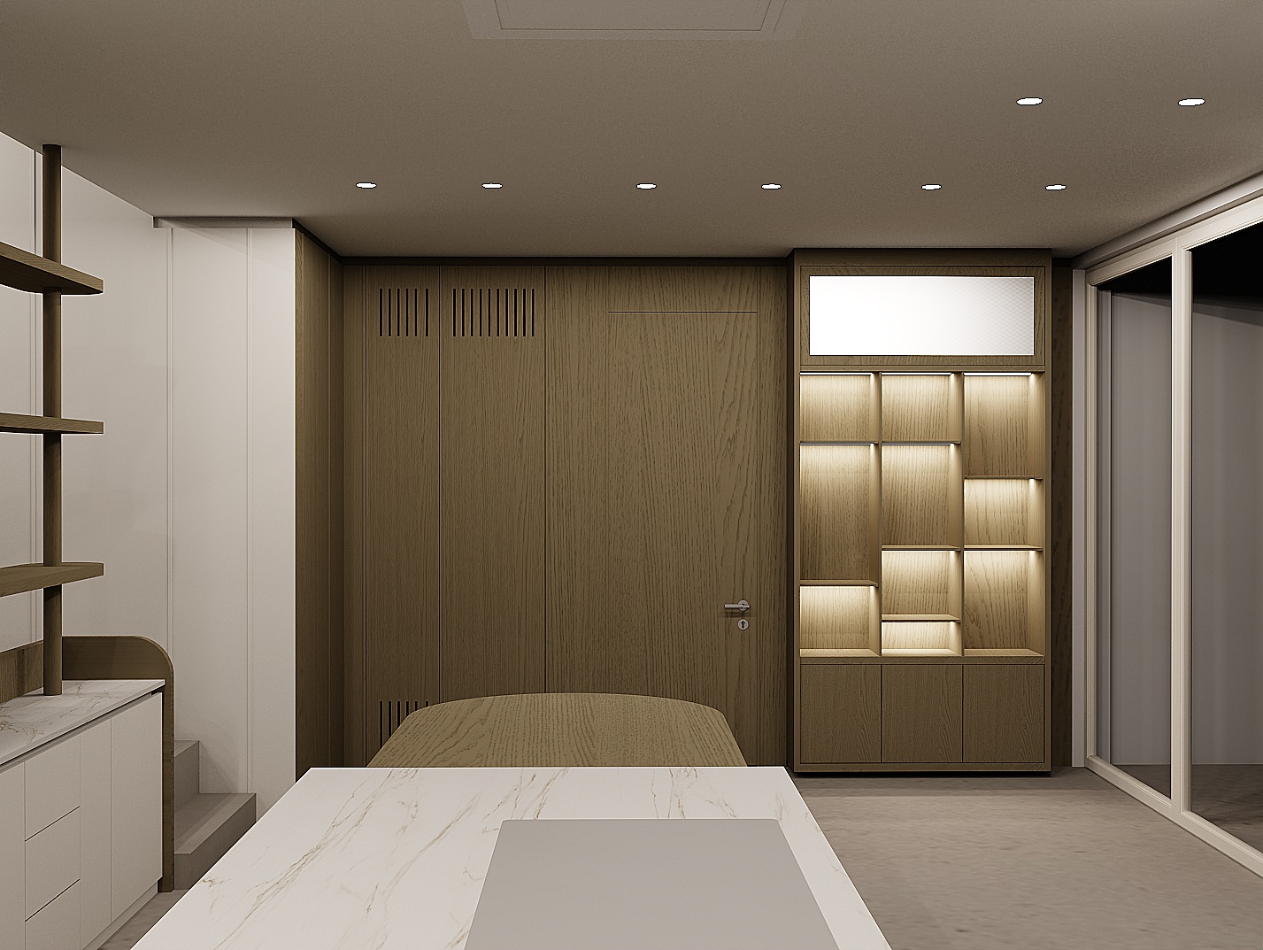 there should be a garden and sea view in the window on the right side