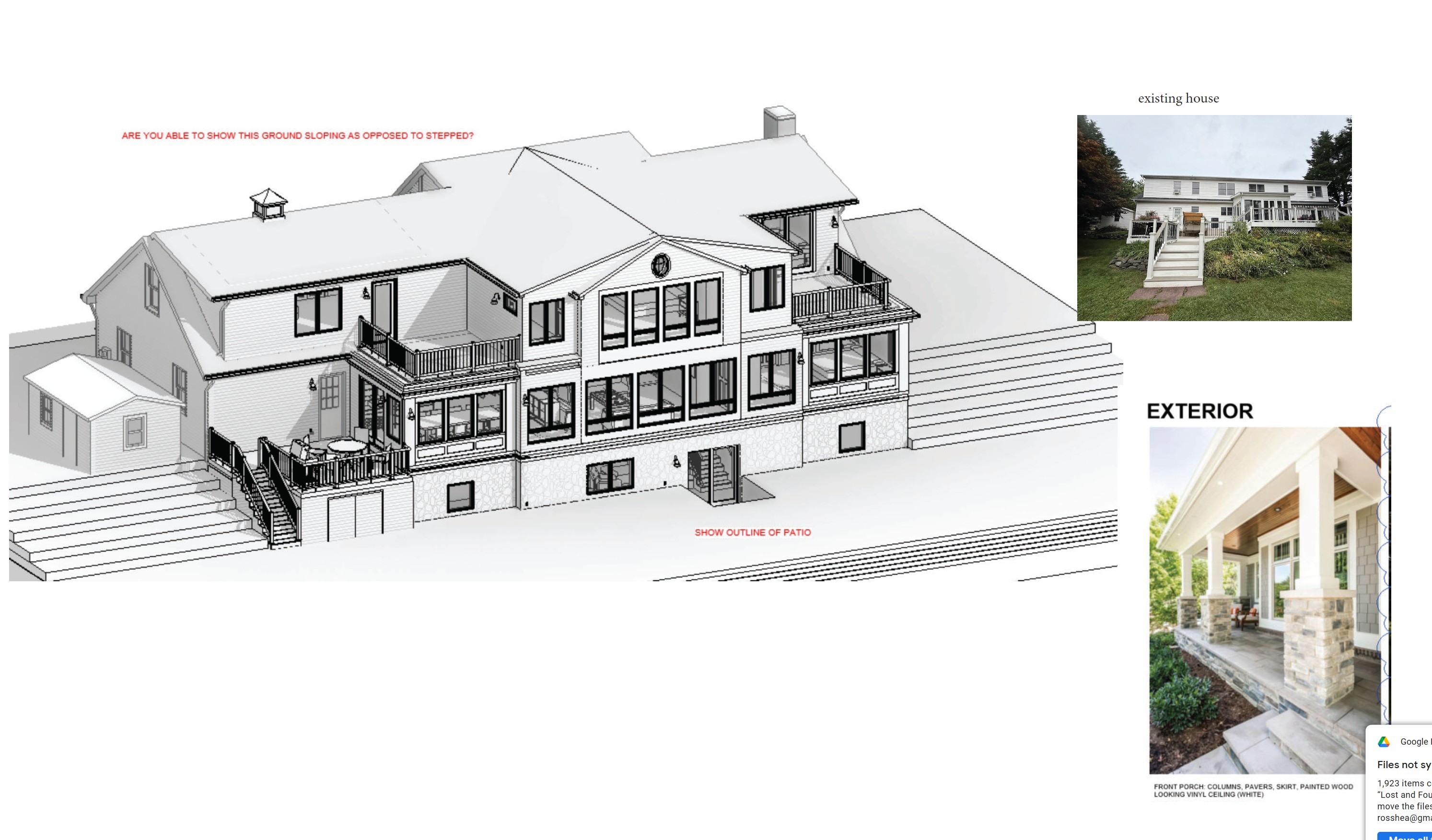 using the black and white drawing create a photo realistic rendering the siding will be a white and the trim will be white the shingles should match the shingles in the existing photo the new deck should match the exsiting put trees where it is shown in the existing the exterior basement level should receive the stone finish