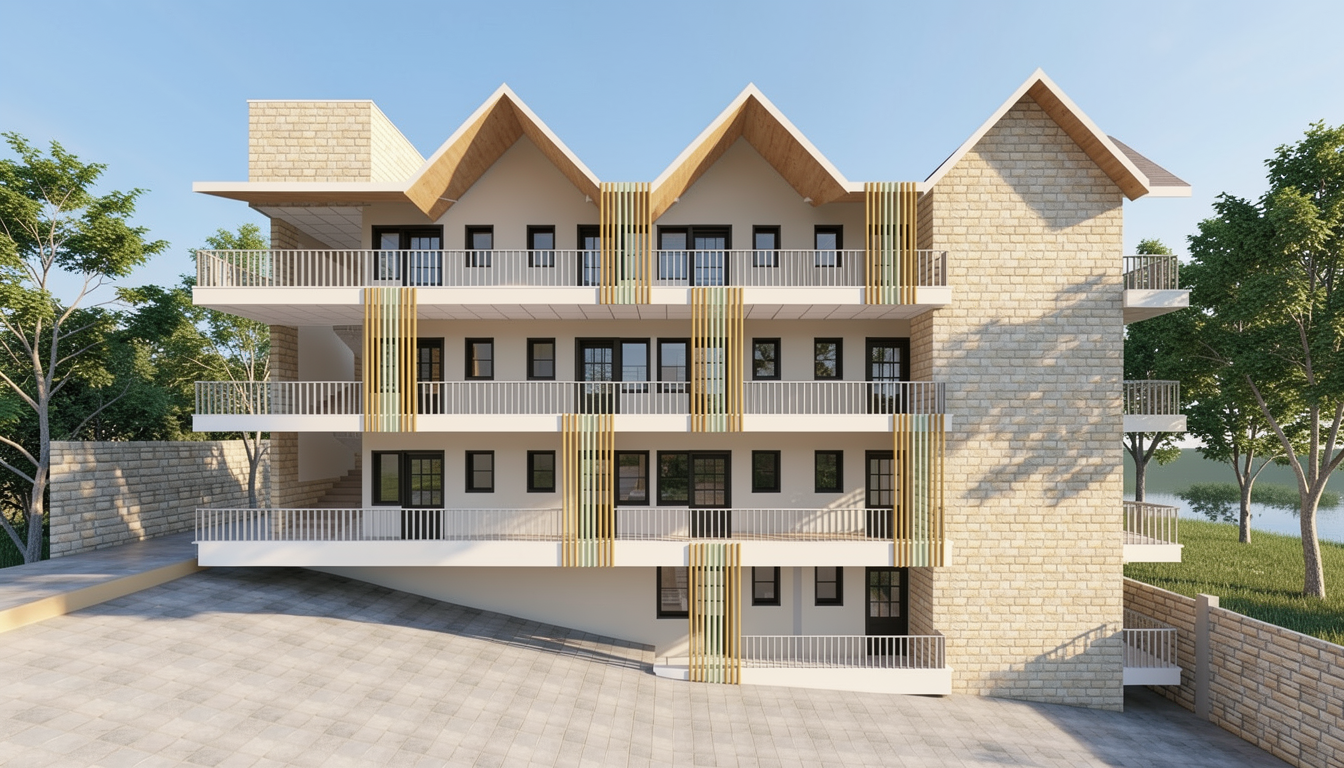 exterior shot transform the uploaded clay massing model into a photorealistic architectural render using the mood board as reference