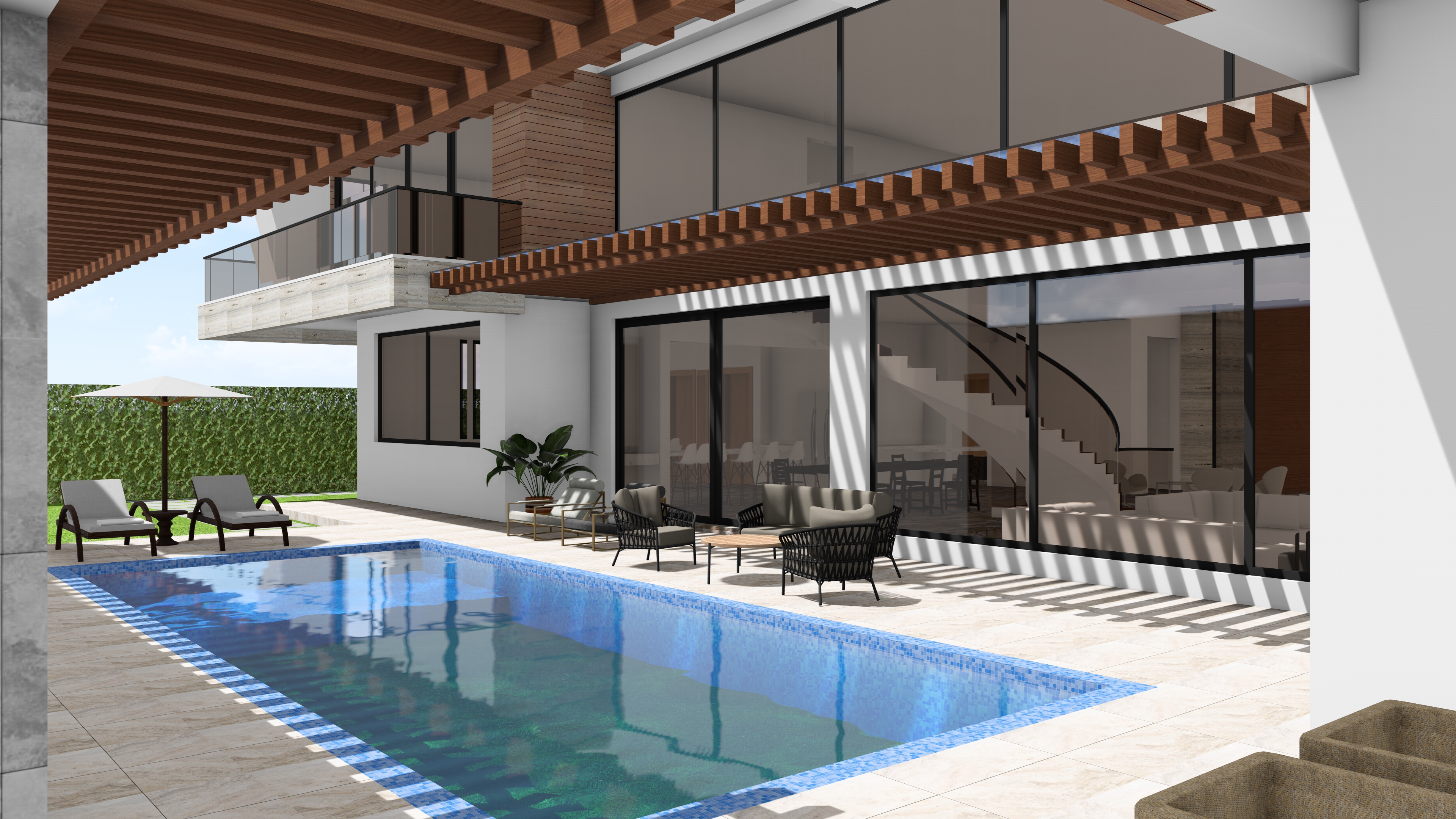 image of pool side add few trees in background for context add some potted plants and make scene look lived in