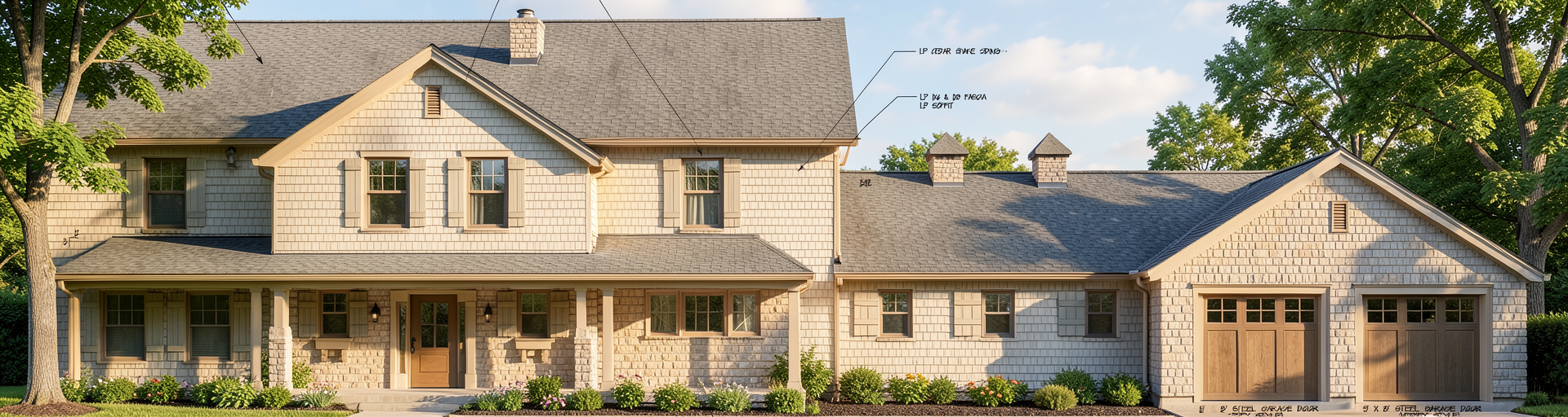 add landscaping plants only where green grass is shown replace stone with a light colored natural limestone add daytime sky show siding to have a vertical pattern and to be darker and less orange add a logo sign above the eyebrow canopy over the entrance for marsh mclennan agency blue one from the website with no white background show all storefront frames and window frames as black maintain stucco areas as stucco and use colors shown add plants at base of building where green grass is shown make stucco on left side middle volume match stucco color on right side use black for all storefront frames and window frames add small tree in corner landscaping island