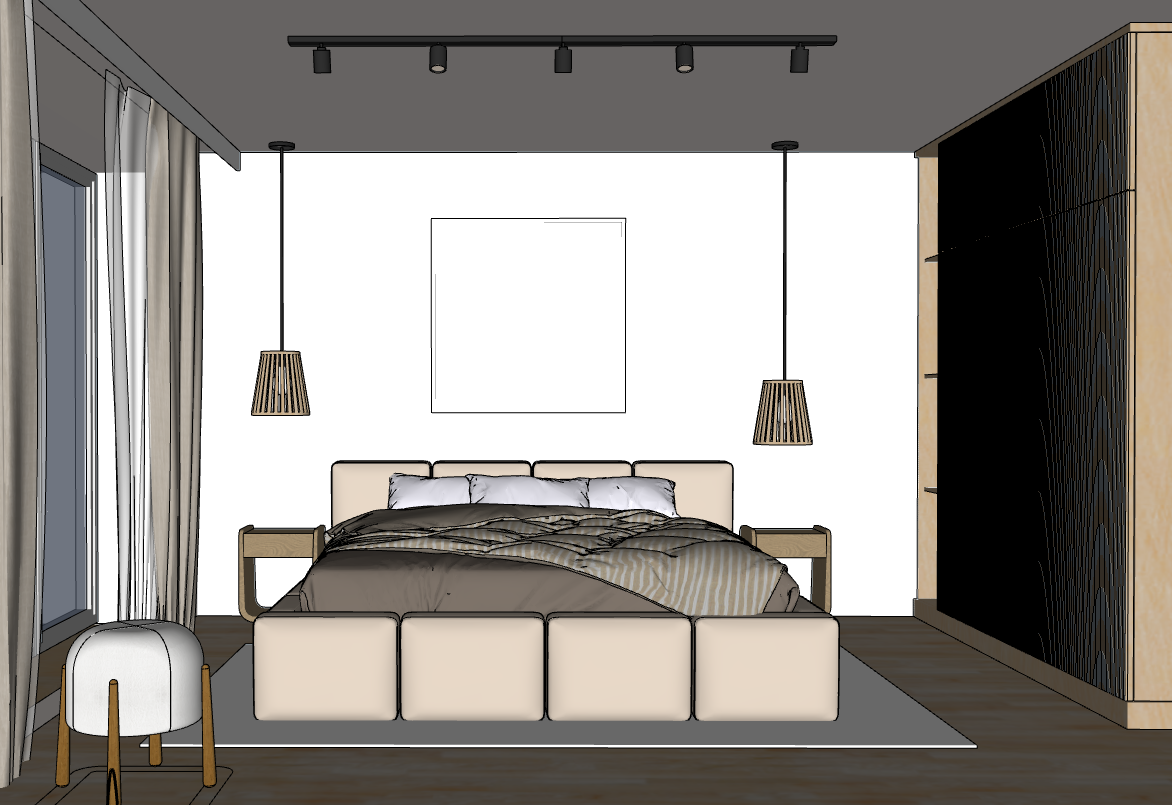 interior shot interior of modern bedroom with light wood on the floor with wooden wardrobe in the right and beutiful painting above bed under the bed there should be a bamboo carpet the wooden wardrobe is covered with lamellas
