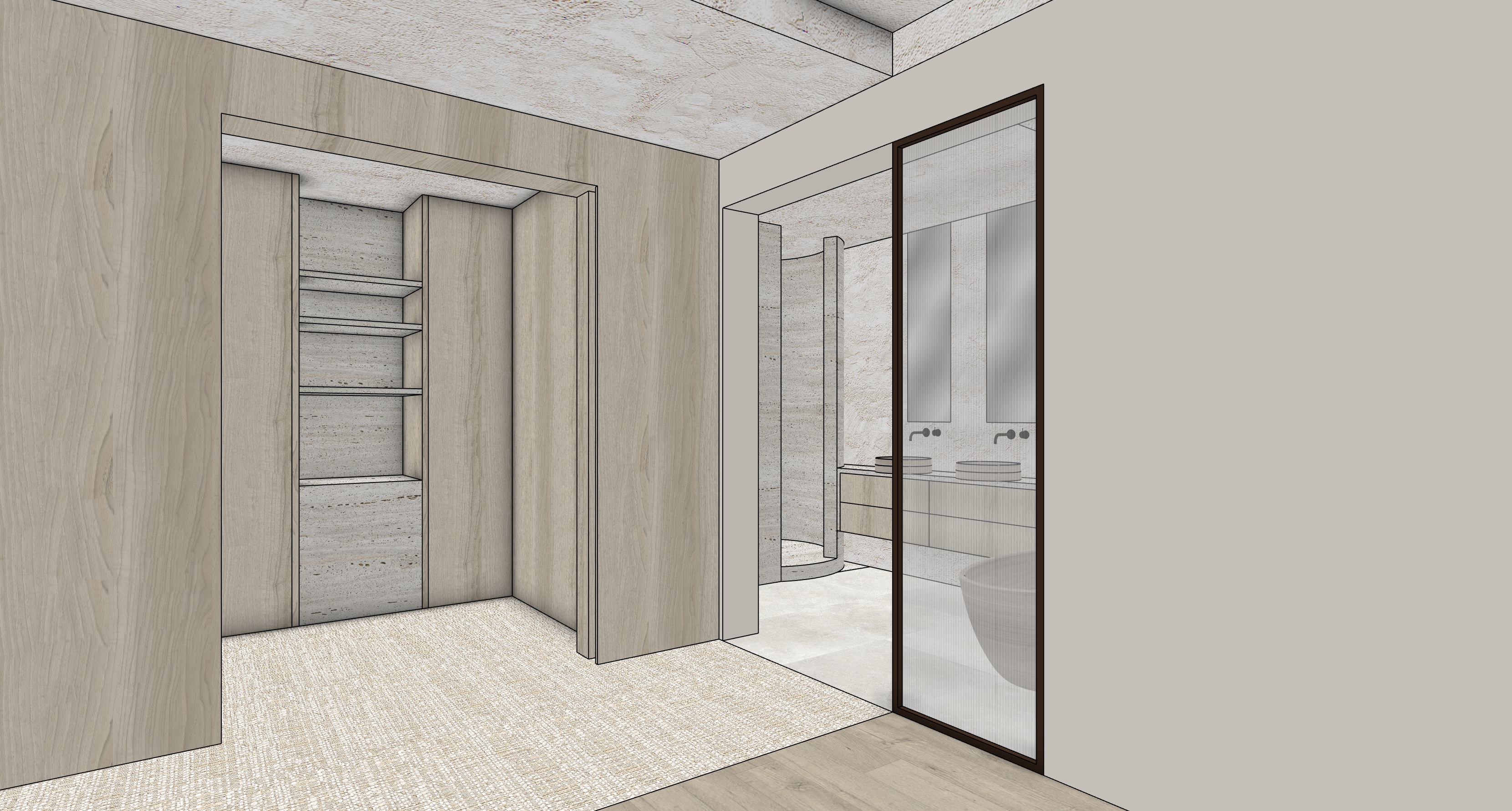 this is a high end mediterranean villa in marbella create a high end architectural interior realistic render calm and refined atmosphere soft natural daylight neutral warm palette balanced tones no orange cast diffused light with soft shadows subtle contrast natural color accuracy emphasis on materiality and texture tactile surfaces minimal styling clean architectural lines integrated design serene and timeless space depth and layering cinematic softness slightly desaturated tones photorealistic 35mm lens soft color grading quiet luxury emotional balance breathing space no harsh lighting no strong color cast no oversaturation maintain 100 of the geometry materials colours and layout with a sharp photorealistic result add more natural daylight facade rough stucco finish in combination with the darker accent open pore travertine tiles but in a natural colour the darker details is dark bronze finish plated steel floors a nice fluffy fixed carpet combined with natural oak wood floor bathroom in ceramic tile sand colour 100x100 add some more life to the scene make the design better