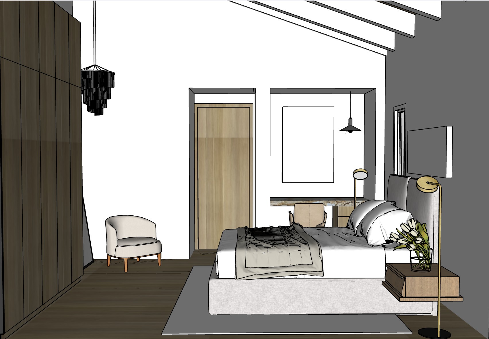 love this create photorealstic side view of the same guest bedroom keep all space plan and parameters where they are in image keep light oak finishes on floor ceiling and cabinetry add texture to rug keep beams white keep colors modern and add natural light coming through sliding door keep space plan exact add light to seaglass chandelier hanging over chair keep all wall finishes white add modern organic coastal photography images to art over desk area and art over bed remove extra window keep window on left wall as is with white frame and add linen roller shade