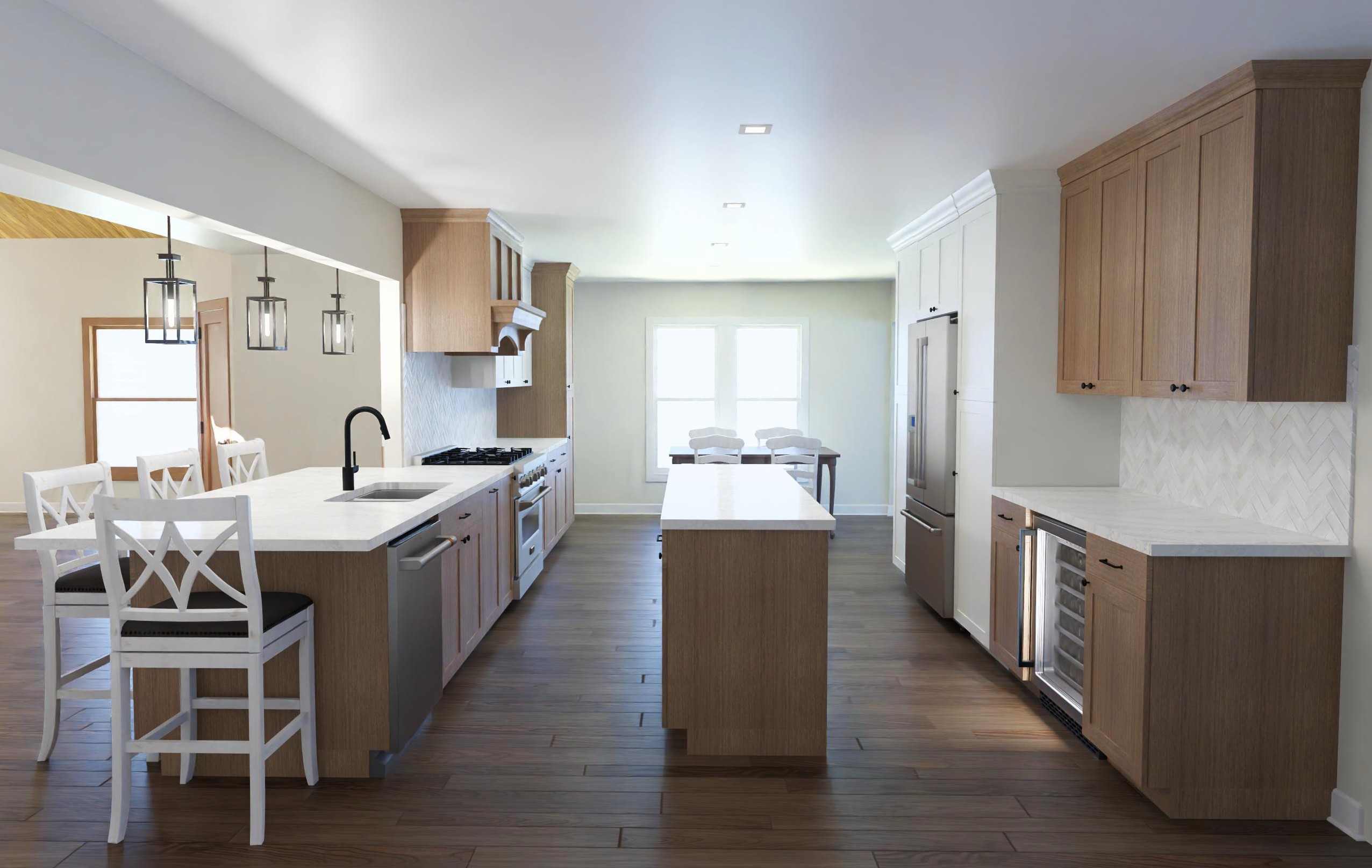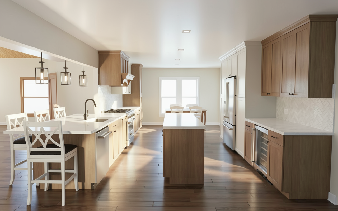 lightly stage this kitchen rendering without changing colors the right side countertop will be used as a coffee bar