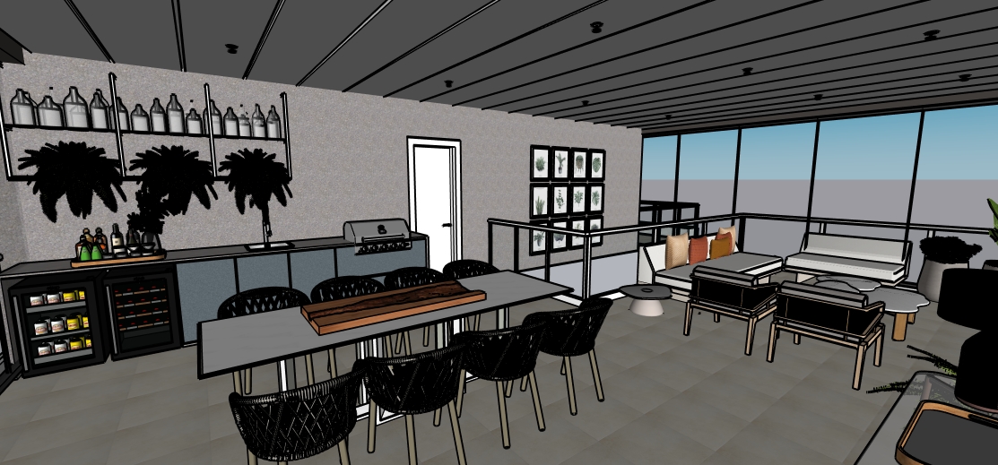 a modern stylish indoor patio with a sophisticated warm atmosphere the floor is elegantly tiled in soft gray tones the ceiling is sleek with recessed lighting painted in a matte charcoal gray along the left side a bar with wooden shelves displaying various metallic and glass bottles in subtle silver and amber hues beside the bar a stainless steel grill with a glossy finish a long dining table crafted from polished dark wood is surrounded by black woven chairs adding texture and class behind it create a feature wall with decorative black silhouettes of lush palm leaves the far wall boasts a series of framed botanical prints in muted greens and whites adding a touch of nature the seating area has plush off white cushions with accent pillows in earth tones terracotta soft gray and sandy beige on modern rattan chairs and a minimalist sofa large glass windows allow soft natural daylight to flow in casting gentle shadows across the room for a cozy inviting feel