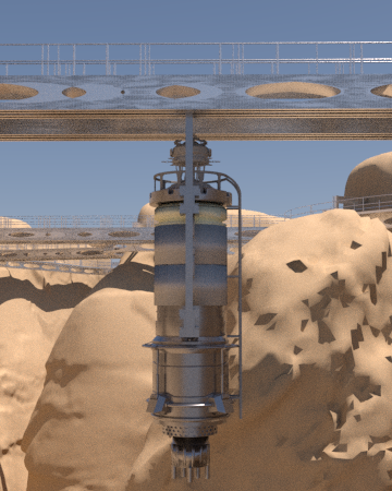 realistic canyon walls rocky heavy metallic machinery warm tones architecture
