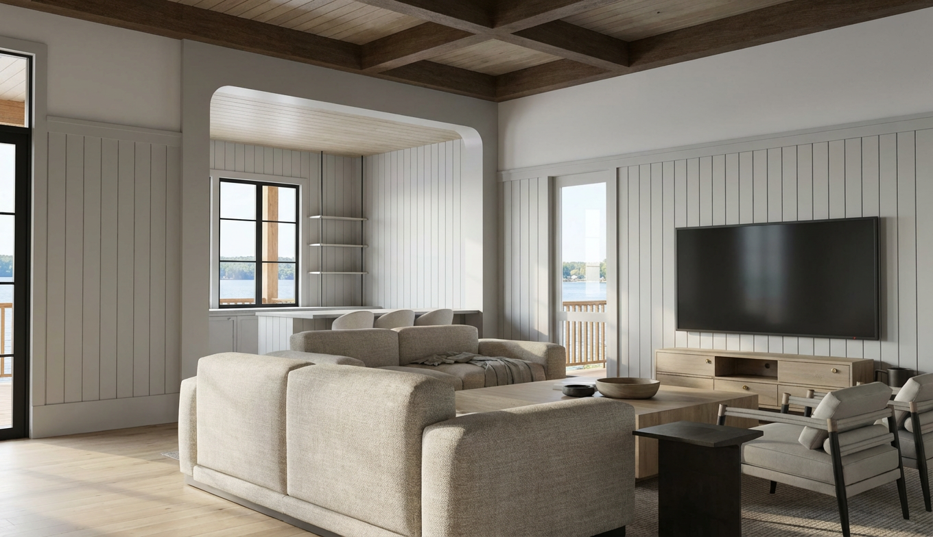 create a front porch with warm ambience the wall to the right should have beadboard 1 3 of the way up that seamlessly transitions into window screens