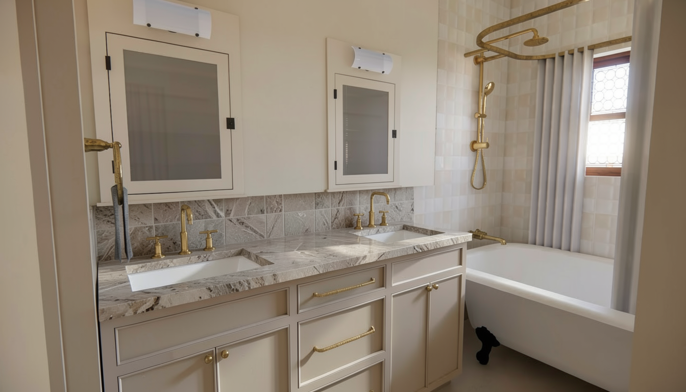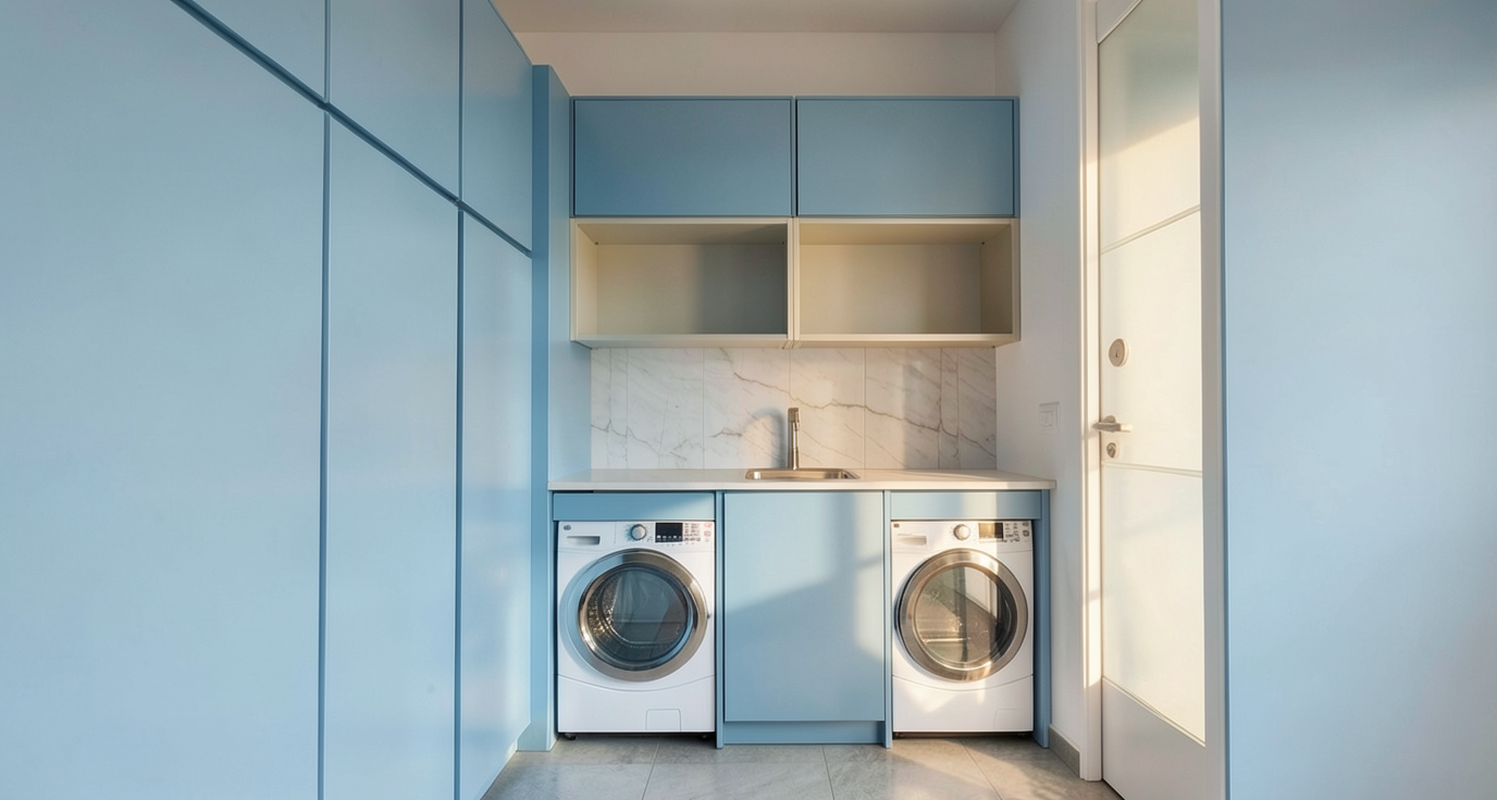 crea una imagne fotorealista a partir de este sketchup pon los muebles en color azul grisaceo