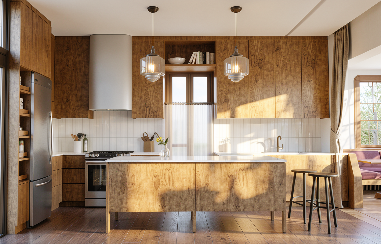high tech interior shot zmodernizuj mi tuto m stnost kter je z rove kuchyn j delnou i ob vac m pokojem podlaha schody a krb zustavaji stejne ale udelaj novou kuchyn televizi na zdi dej pryc knohovnu ale udelej polici a vymen sedacku architecture