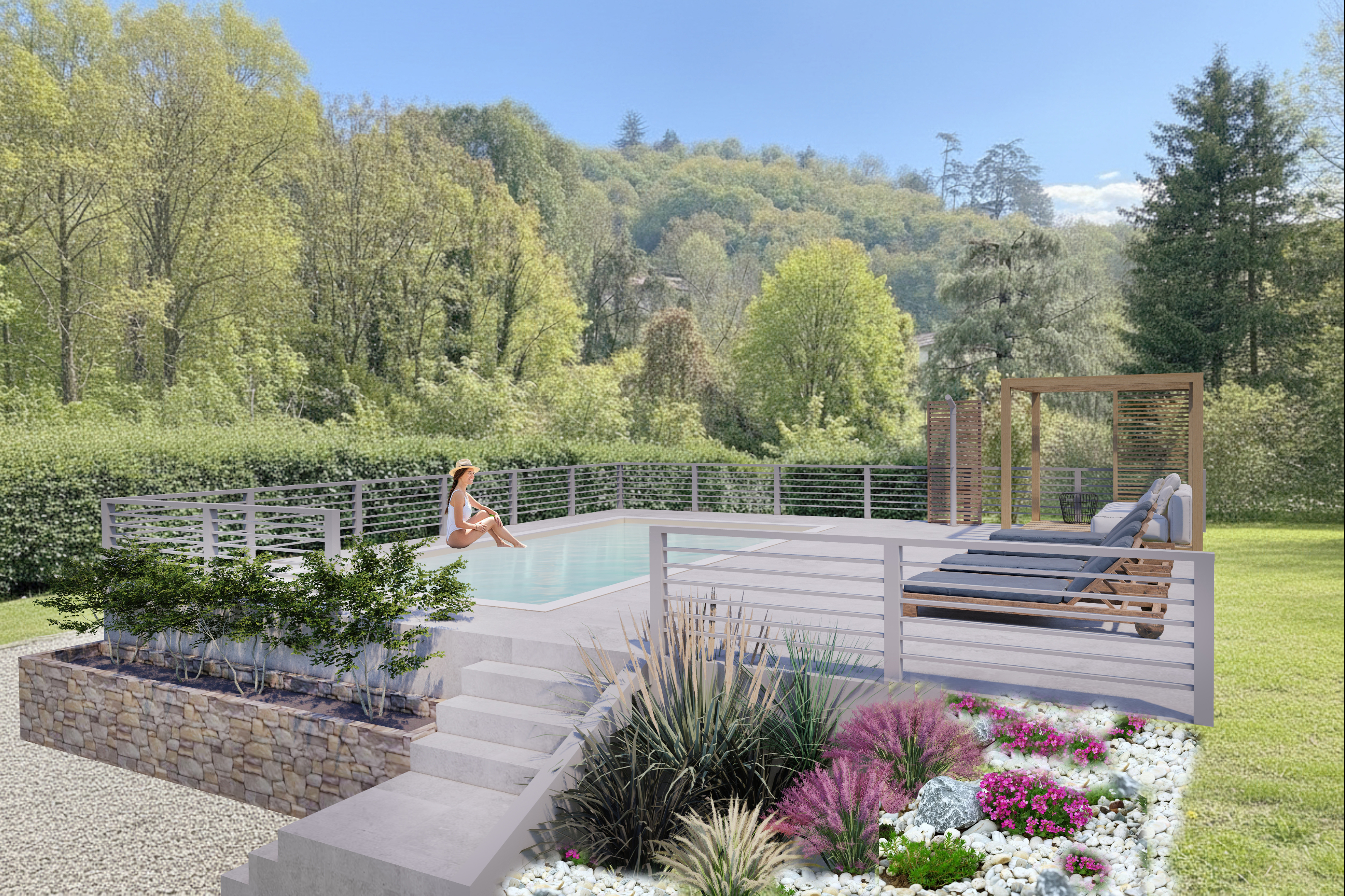 a pool with a solarium made by stone tiles some sun loungers a pergola with white sofa and a sun shower on it a rock garden in the foreground a girl is enjoying the sun