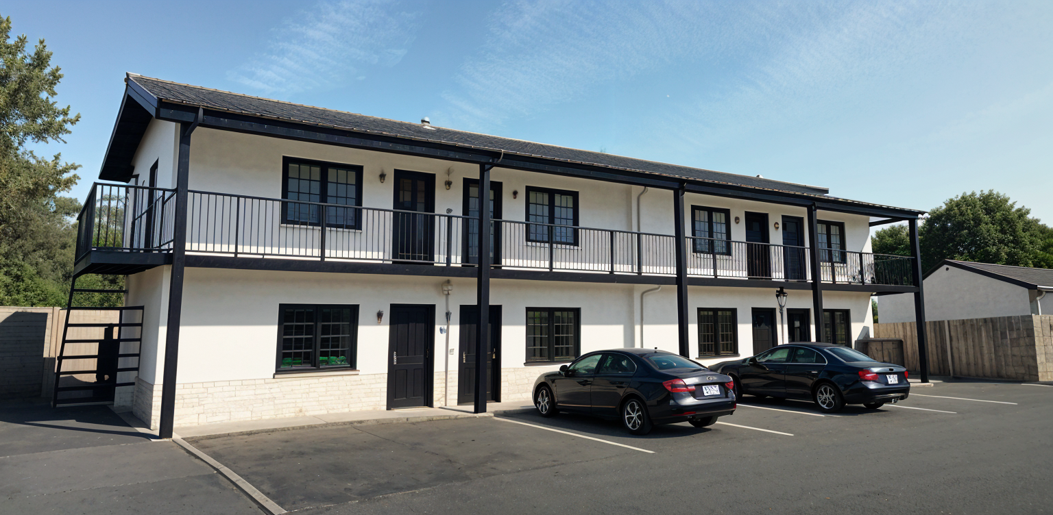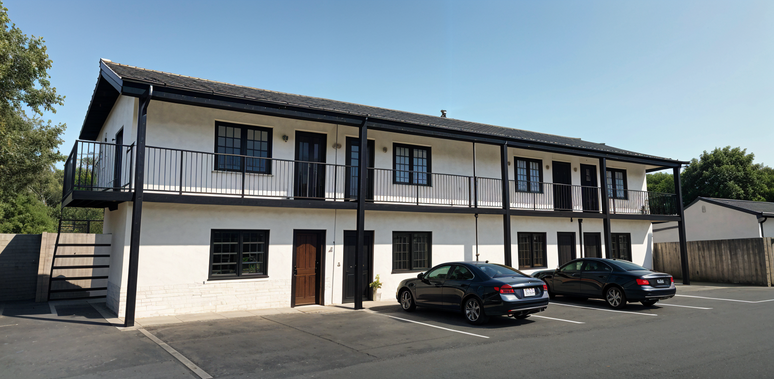 add more steps on the stairs on the left change building color to white cement plaster add brick whith white paint at the base of the first floor all door colors to matte black add people