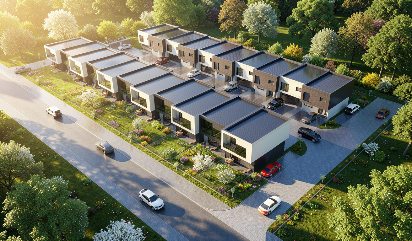 interior of a cabin made of novatop wooden panels with spruce panels on the left side the ceiling does not extend all the way to the wall leaving a strip of white woven mesh there is a red tiled stove the windows are light blue and the doors are light green the kitchen unit is in the same blue color as the windows the flooring is light gray in a warm tone with a stone like pattern as in the design background is forest