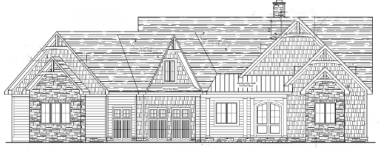 exterior shot stone dutch quality oak blend limestone windows black trim ppg mountain gray siding ppg stonehenge gray garage and front door dark walnut roof black architecture