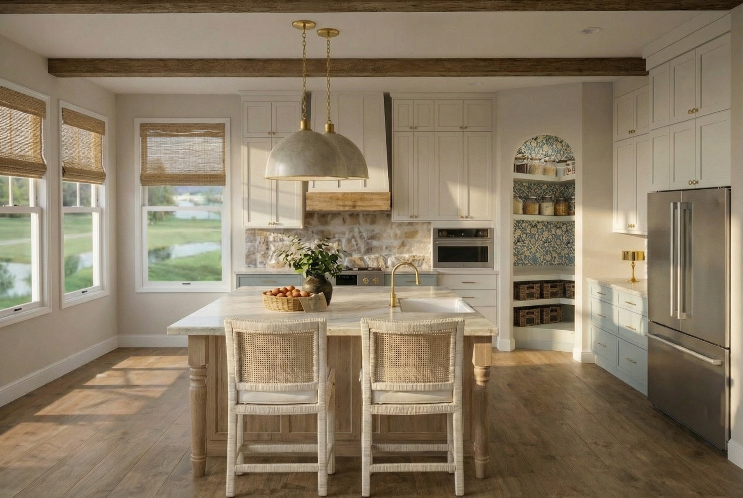 add drapes to these windows with a brushed brass rod and rings