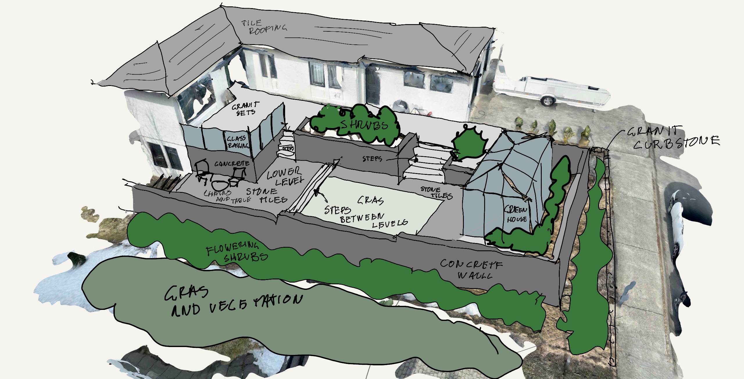 here are a few prompt ideas to translate your architectural sketch into a photorealistic drone image all of these prompts will strictly maintain the geometry and the high angle slightly oblique perspective from your sketch to make the process easier you can copy the full text of your chosen prompt which is ready to use i have designed these prompts to maintain a very high consistency with your original drawing common elements included in all prompts to ensure the final image is a direct match i will include specific instructions for all prompts if you are experimenting with variations these elements are the non negotiables geometry and viewpoint the exact perspective and proportions must be maintained structure the house its windows doors and complex roofline must be replicated exactly infrastructure all precise locations of pathways the circular drive and the distinct parking areas must be identical the creek a photorealistic clear meandering creek with smooth water worn stones option 1 the golden hour summer meadow this prompt focuses on warmth soft light and the iconic low angle light of the nordic summer making the architecture look inviting key visuals soft golden yellow light extensive purple lupine and green grasses very clear and calm water in the creek vibe tranquil soft established and lush full text a high resolution photorealistic drone architectural photograph of the property defined in image 0 png viewed from the identical high angle perspective and maintaining all structural geometry parking areas pathways and the specific route of the creek the scene is illuminated by warm soft golden hour sunlight filtering from the left west the site is densely planted with characteristic icelandic vegetation large fields of purple lupinus nootkatensis nootka lupine integrated with tall alopecurus pratensis meadow foxtail grasses clusters of low flowering shrubs like betula nana dwarf birch and empetrum nigrum crowberry line the meandering stone filled creek which has clear calm water the pathways and circular drive are precise paved with dark rough volcanic aggregate the house is a precise match to image 0 png constructed with textured warm stained wood cladding and a dark charcoal colored metal roof appearing perfectly integrated into the established blooming landscape the sky is a clear gradient cyan