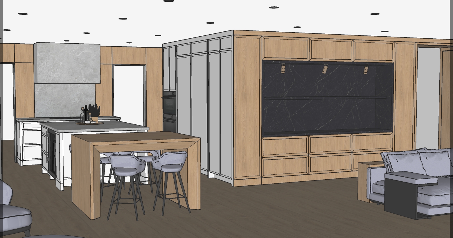 a luxurious and serene kitchen some kitchen doors painted in white color with slim shaker 1 5 iches some doors are wood slim shaker 1 5 inches textura of wood doors egger h3171 st12 oiled kendal oak textures of chairs and sofa are fabric beige color the atmosphere is calm and inviting with abundant natural light filtering through the window casting gentle shadows also is sunny day
