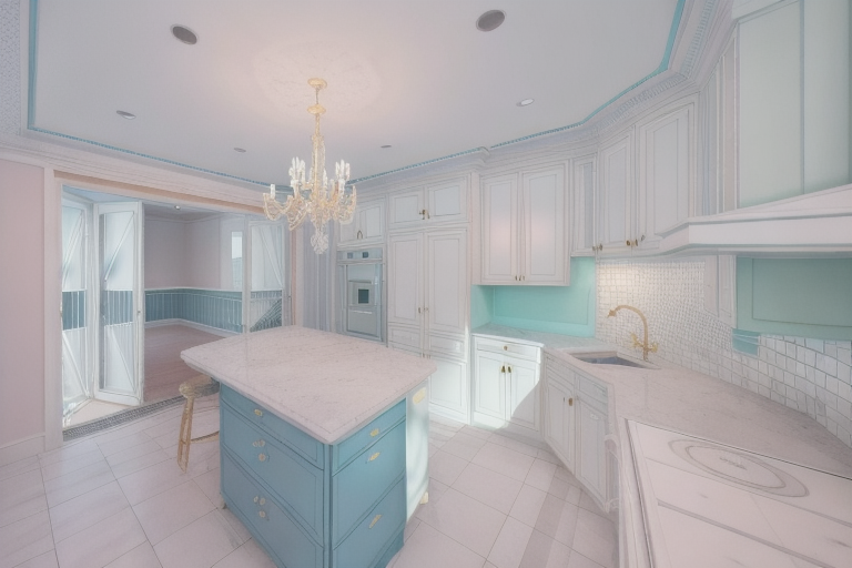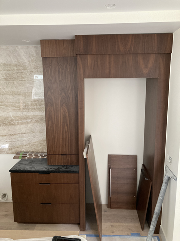 do not change the cabinets in any way preserve the exact cabinet colors materials finishes dimensions door and drawer styles hardware spacing alignment and all geometry exactly as shown do not alter the countertop shape backsplash appliances flooring lighting fixtures or wall structure only remove the construction materials clutter and mess from the scene clean the room and make it look finished and staged add a few simple tasteful home accessories appropriate for the style of the space but do not add or remove any furniture windows or architectural elements maintain the original lighting direction and realism enhance clarity and polish the photo while keeping the cabinetry and room design completely unchanged do not alter the lighting to keep the cabinet colors as they are in the image add new flooring put a full height refrigerator to fill the space on the right opening put a range to the left of the base cabinet with a stainless hood above