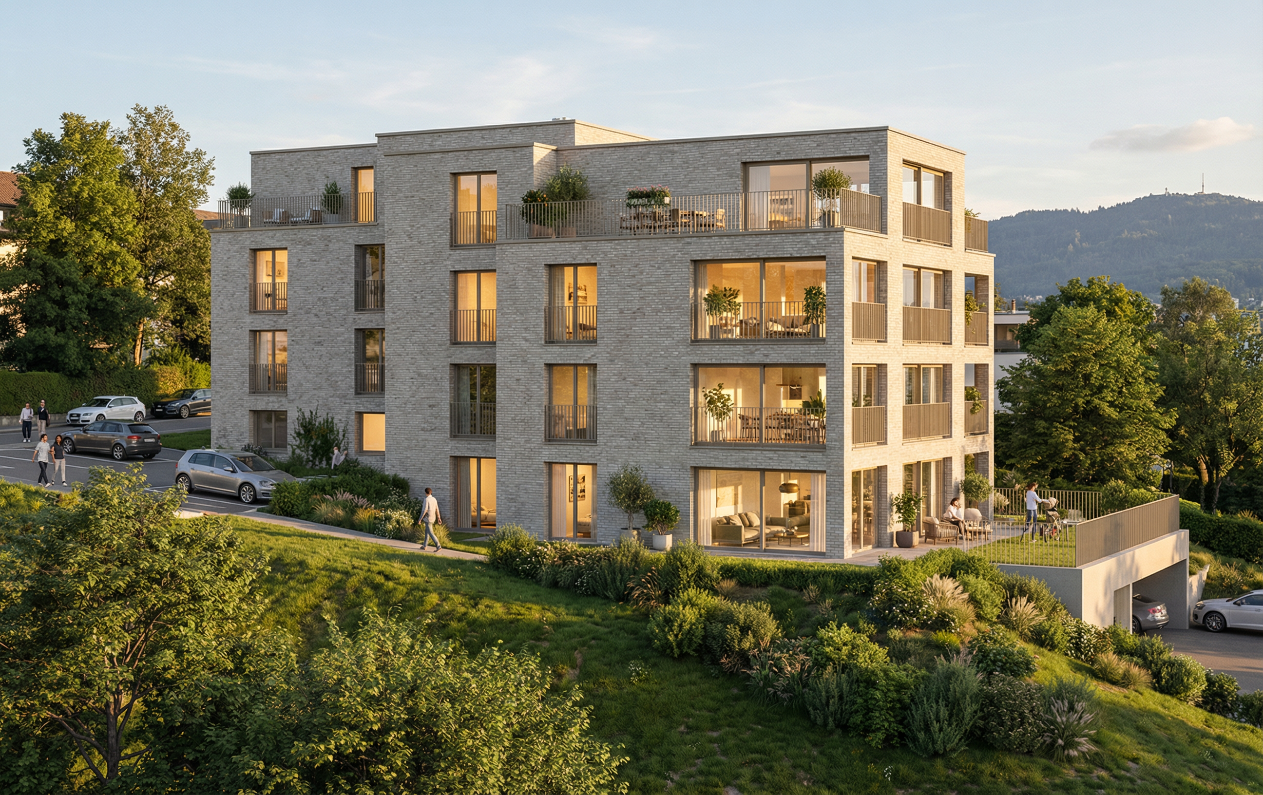 genau dieses rendering berarbeiten fotorealistisches foto exakt dieselbe perspektive und kameraposition wie das hochgeladene referenzbild 100 identische geometrie exakt gleiche anordnung exakt identische fensterpositionen mit gleichem ausblick durch die fenster weiches nat rliches tageslicht leicht schr g einfallende sonne durch die fenster r ume hinter den fenstern k nstlich ausleuchten sanfte realistische schatten realistische materialien echte texturen hochwertige oberfl chenreflexionen echte menschen echte autos pflanzen mit echten b umen und str uchern ersetzen hellgraue klinkerfassade gr ne fl chen mit wiese rasen und einigen b schen ersetzen sehr realistische umgebung links oben ist die strasse b ume links oben unten rechts natur nat rlicher himmel mit leichter bew lkung im hintergrund der z richberg belebte szene mit menschen canon eos r5 35 mm festbrennweite f 2 8 nat rliche farbwiedergabe leicht warme farbstimmung golden hour feeling hyperrealistisch dslr qualit t raw aufnahme 8k aufl sung extrem scharf perfekte tiefensch rfe professionelle architekturfotografie