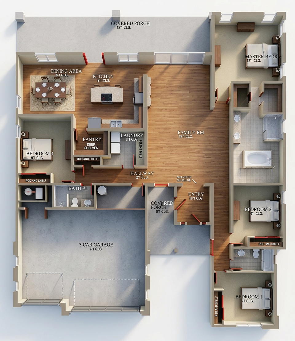 show with black windows and doors a stucco fireplace on the deck add a background furniture on the deck and patio below and minimal modern landscaping