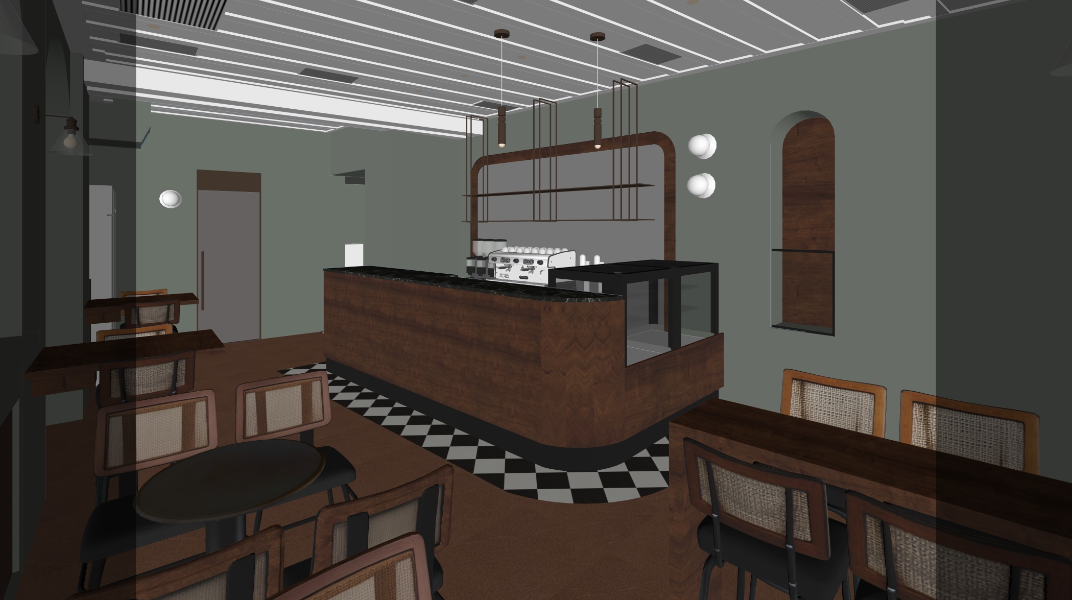 transform the provided coffe bar interior image into a high end photorealistic render with warm golden hour atmosphere soft glowing highlights and relaxed upscale coastal energy while keeping everything exactly the same same proportions same bar shape same booth seating same ceiling curves same wall finishes same yellow curtains same materials and same spatial configuration do not move or alter any objects geometry textures colors or furniture positions the chairs throughout the restaurant must remain exactly in the same locations and proportions but their materials should read realistically chairs should appear upholstered in soft reddish teracotta fabric with subtle natural tone but upholstere with a matte plush surface and gentle directional nap while keeping their shapes frames and positions unchanged add premium table settings including coffee glass and a cake on plate while keeping all tables and chairs in their exact positions include modern young guests seated at the bar and at selected tables casually social correctly scaled tastefully integrated without crowding or obstructing architectural details add two bartenders behind the bar preparing drinks and interacting naturally while preserving the bar s structure and alignment the display counter must clearly appear filled with cake and sweet with cool reflections moisture and texture while keeping its exact position and shape unchanged on the bar shelves add wine bottles and premium alcohol bottles arranged tastefully and evenly while keeping the shelving structure unchanged the shelving should feature warm and bright accent lighting enhancing reflections and bottle silhouettes the wall behind the bar shelves must clearly appear as amber glass in a deeper richer golden amber tone with a ribbed textured surface and illuminated from behind with warm vivid backlighting while maintaining its exact geometry proportions framing and alignment lighting should emphasize golden hour warmth gentle reflections soft shadows enhanced color richness and luxurious catalog level realism improve depth and realism through wood grain richness marble shine brass highlights fabric texture and polished clarity while keeping the entire scene exactly as originally designed