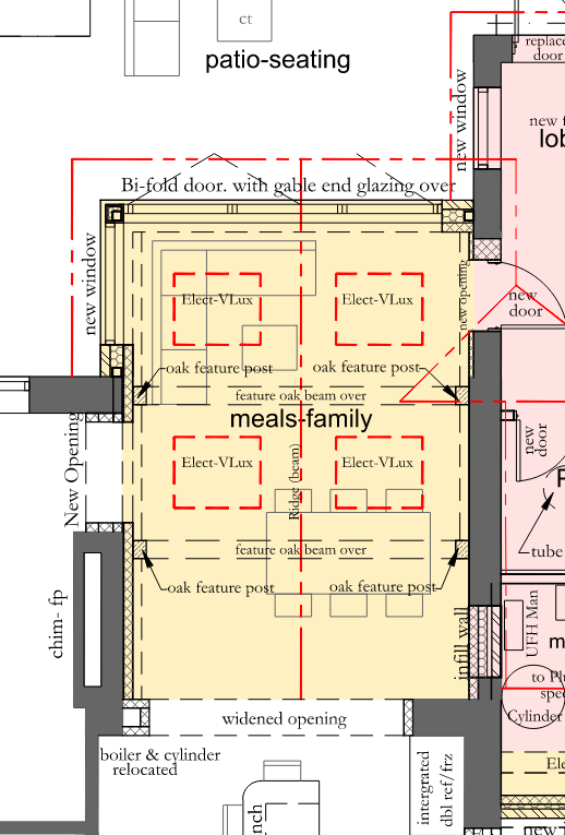 produce an internal view of the new living room vaulted ceiling feature oak posts and colour ties as per this image architecture
