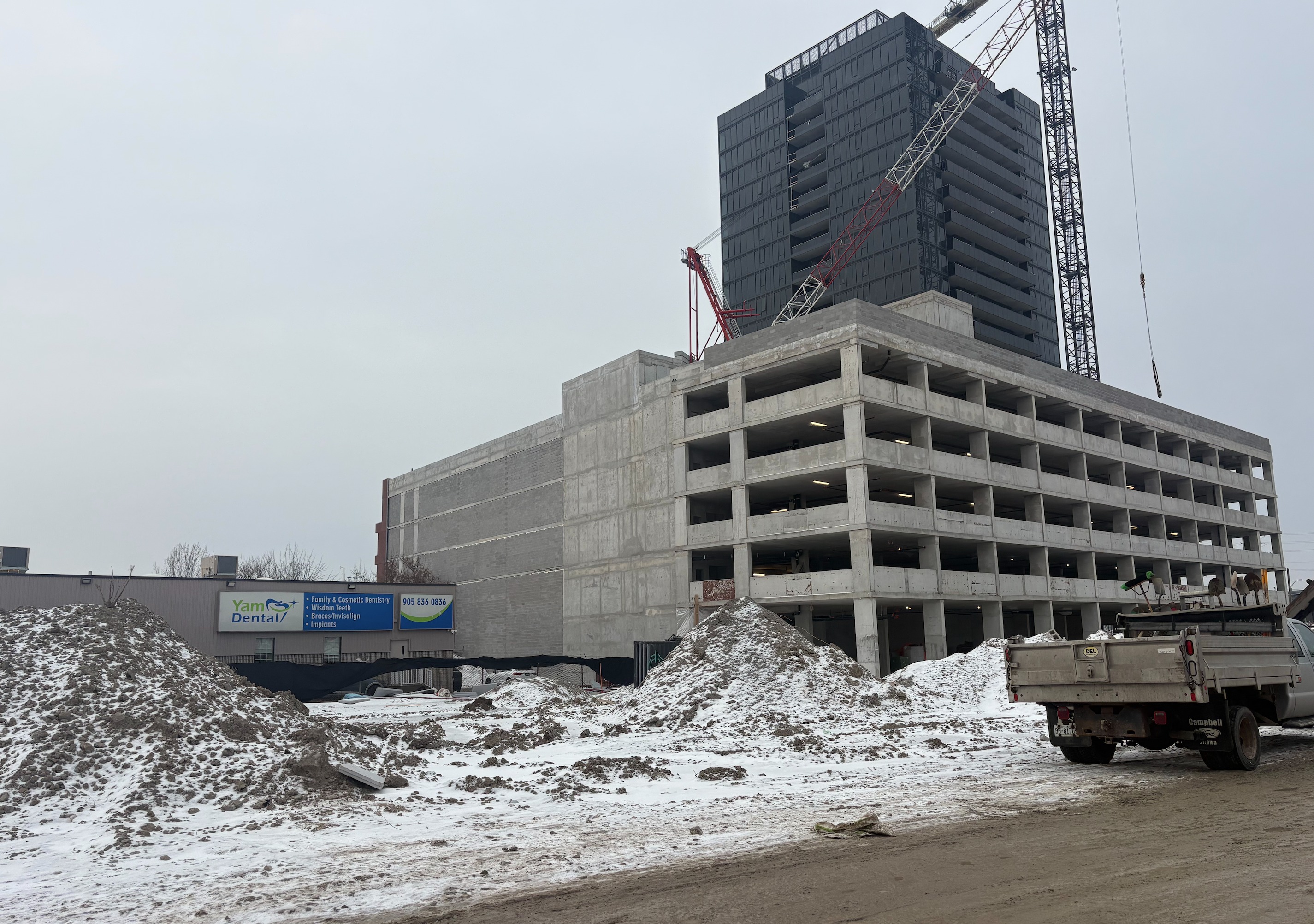 a modern urban parkade sunlight filtering through sharp shadows on the concrete provide landscape on the ground floor remove all forms for constrction material dirt piles and equipment hyper realistic architectural photography