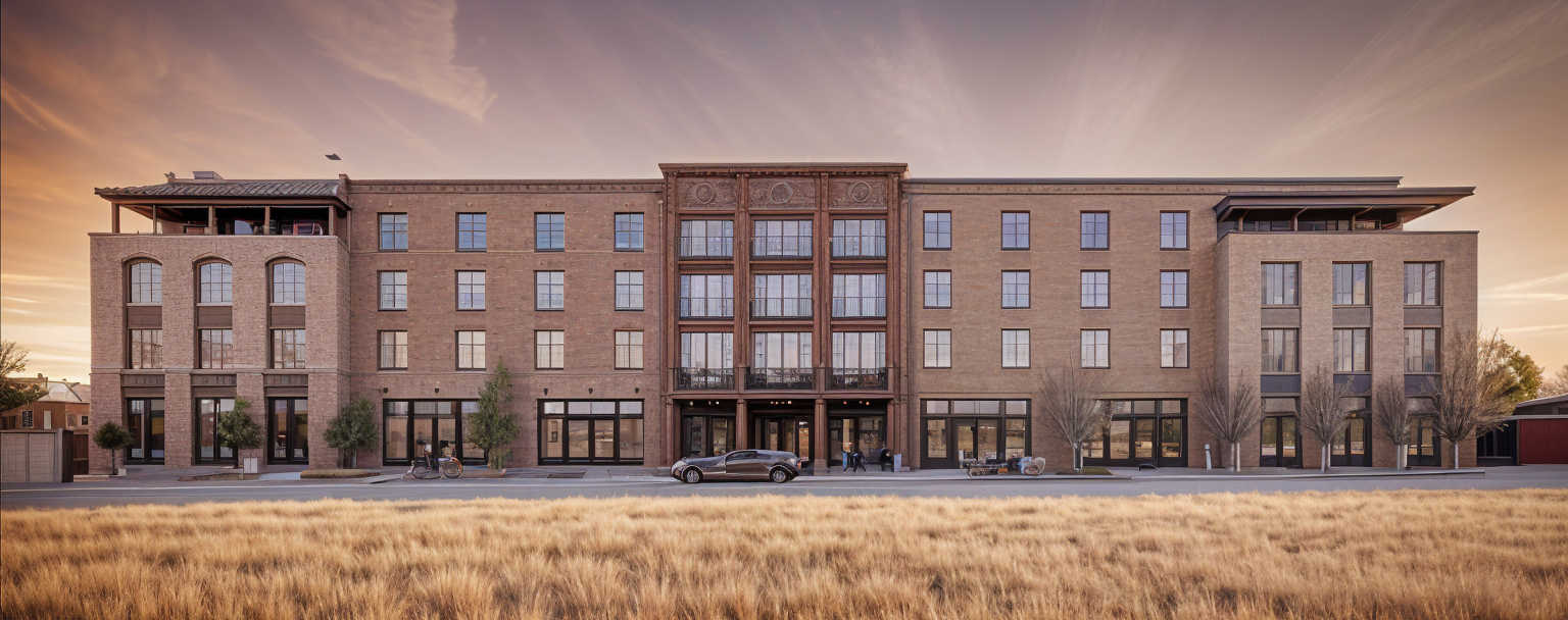enhance the scene with have photorealistic materials and keeping the original colors the atmosphere should be serene and inviting with a bright blue sky filled with soft fluffy clouds add suburban neighborhoods directly adjacent to the building site
