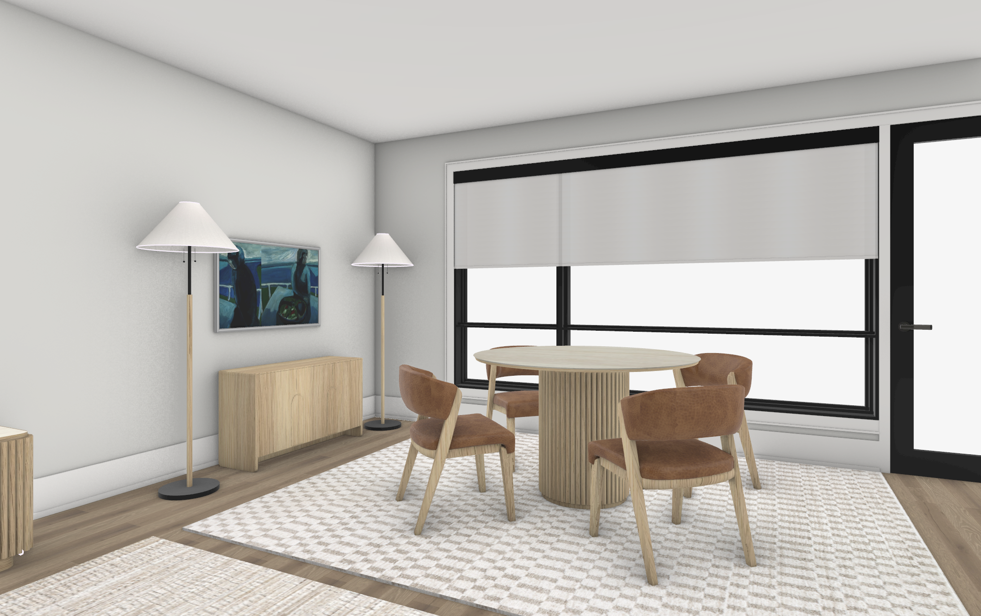 natural lighting light wood tones add a city backyard with deck in the background add accessories to side cabinet