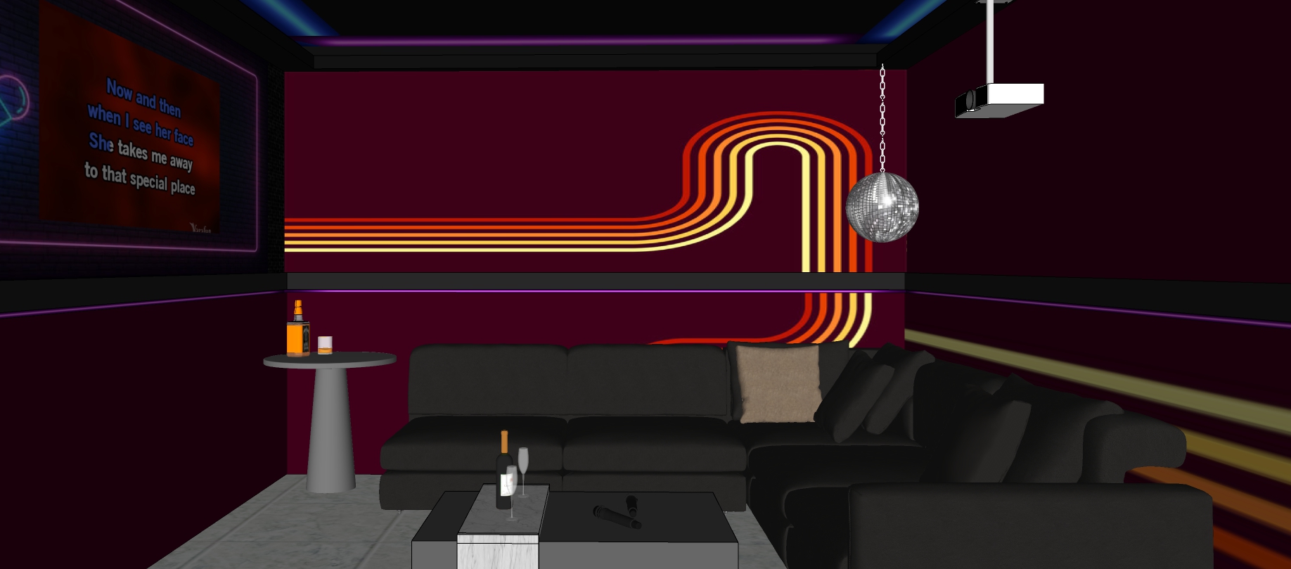 render an interior ktv room maintain the photo with black painted ceiling with led cove light retro interior design ktv room