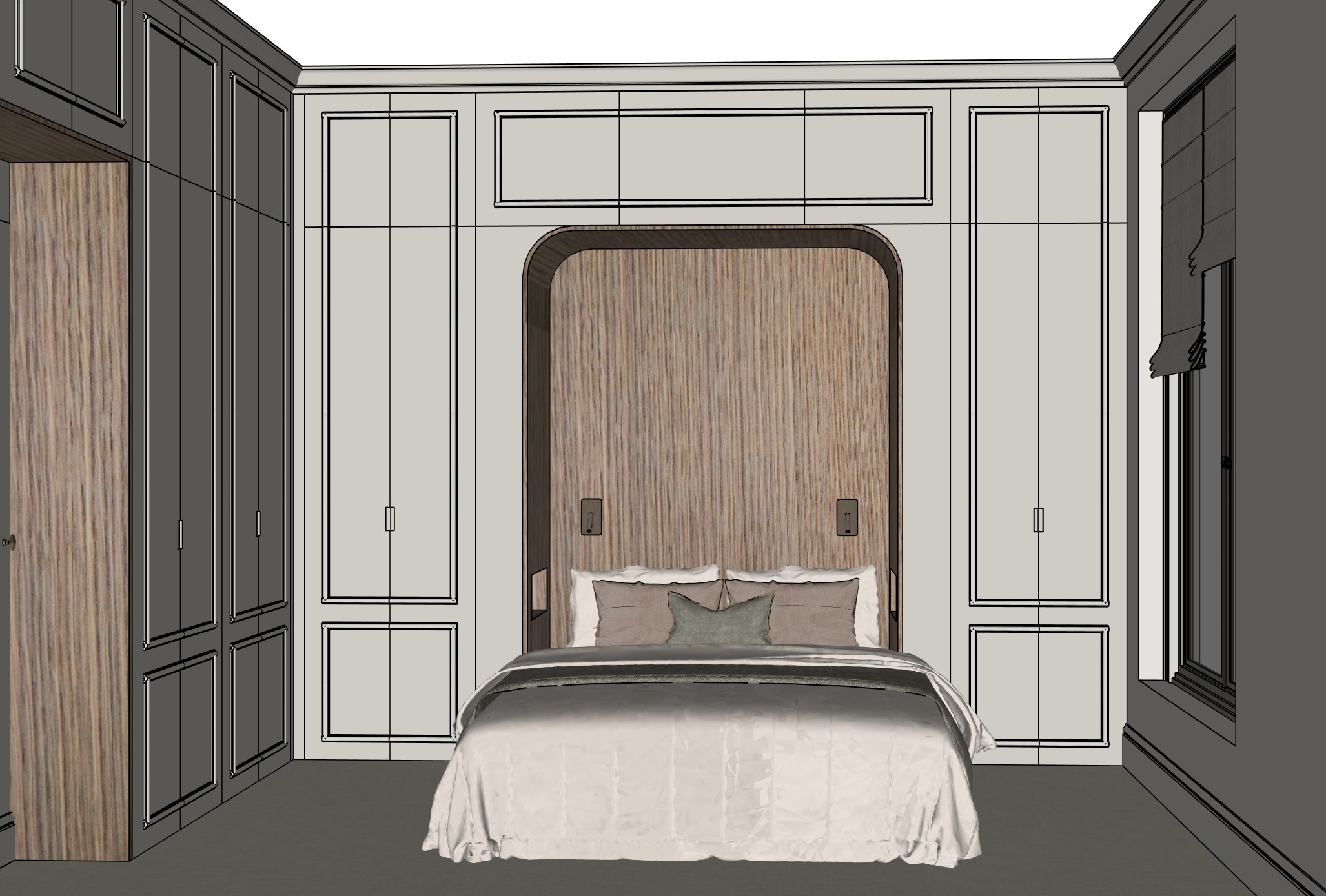 the apartment is located on the 3rd floor of a parisian building there is an off white carpet covering all the floor the doors of the cabinets are in farrow and ball cornforth white https www farrow ball com fr peinture cornforth white the wooden parts are in wood like this one https www ober surfaces com fr oberflex essences fines noyer d amerique t266 html there should be a parisian balcony railing outside the window