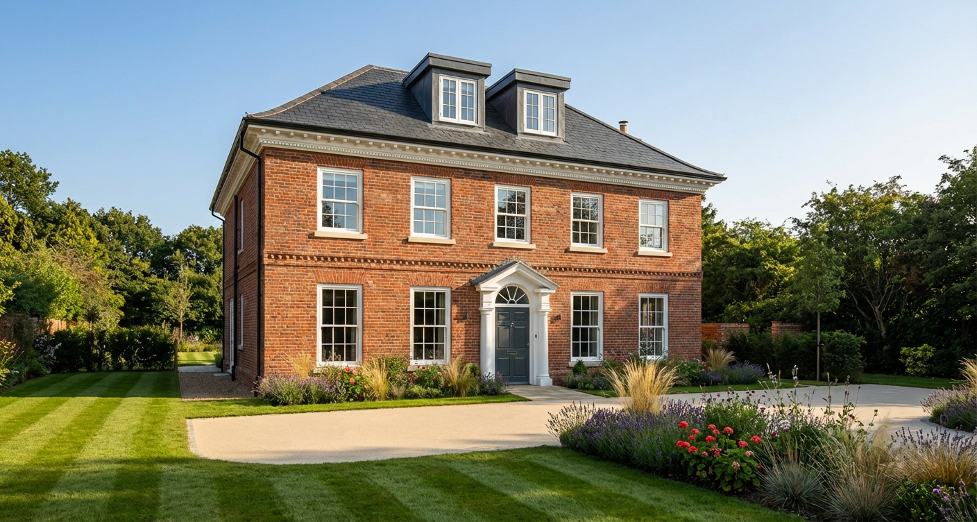 create a modern interior featuring a floating staircase with wooden steps and thin black metal supports the atmosphere should be minimalist and airy the staircase is illuminated by natural light streaming through large windows casting soft shadows on the polished concrete floor adjacent to the staircase place a light wood planter with green leafy plants adding a touch of nature include a sleek black metal shelving unit on the right with neatly arranged books and decor use a soft neutral color palette of whites greys and natural wood tones to maintain a serene and elegant ambiance put a baground of sky and some grass with trees the block in the staircase has a grey one metal frame and inside a smooked white glass with light inside like a lighting block