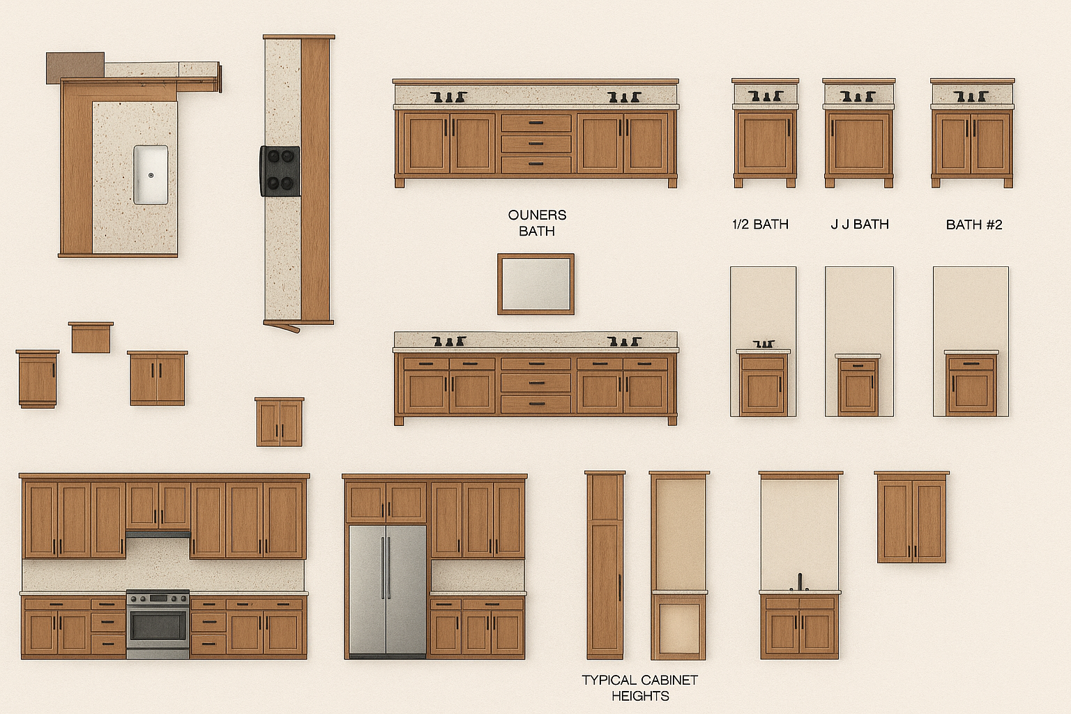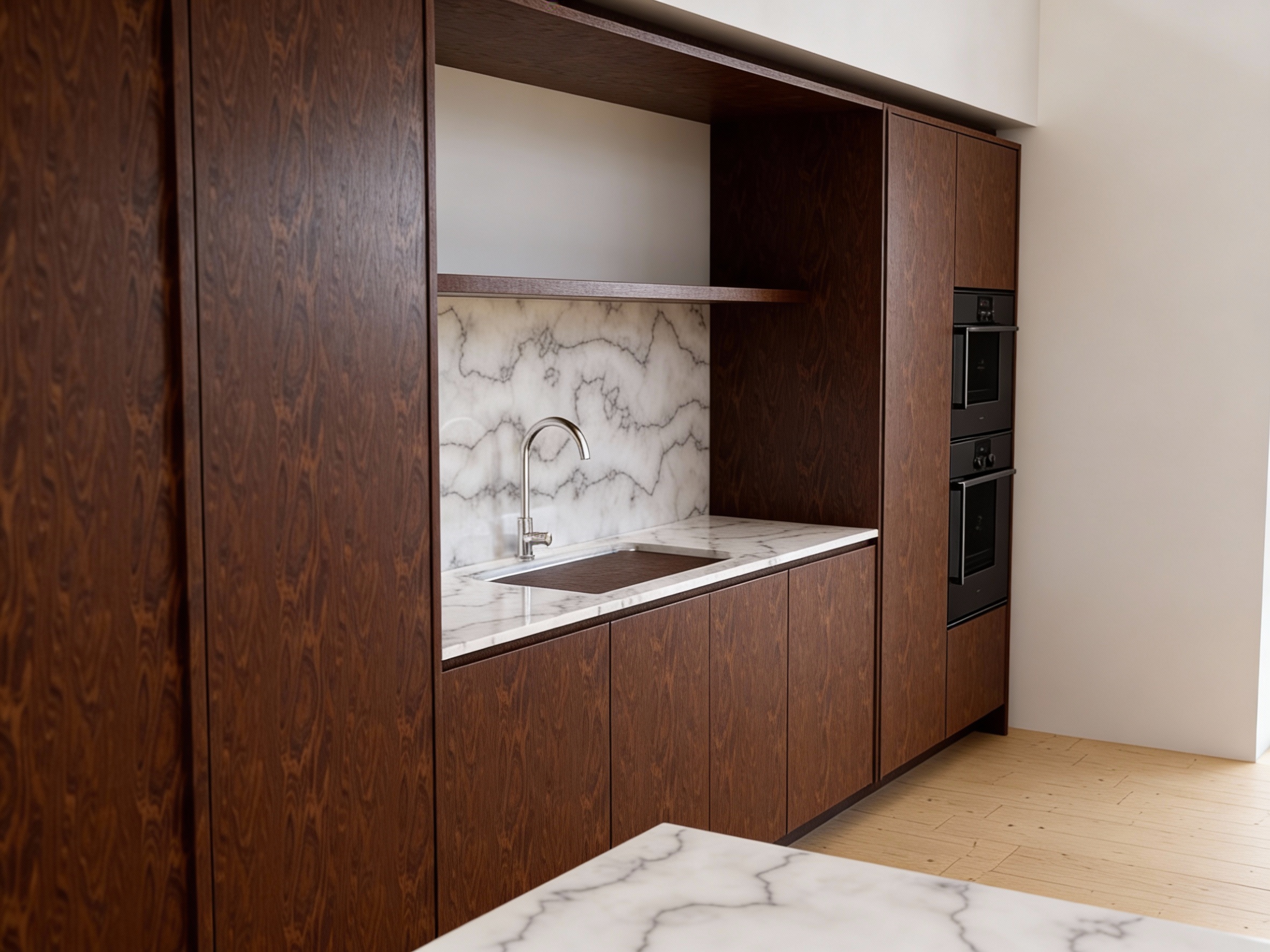 walnut door fronts simple white marble counters and splash back