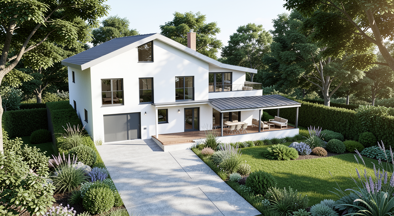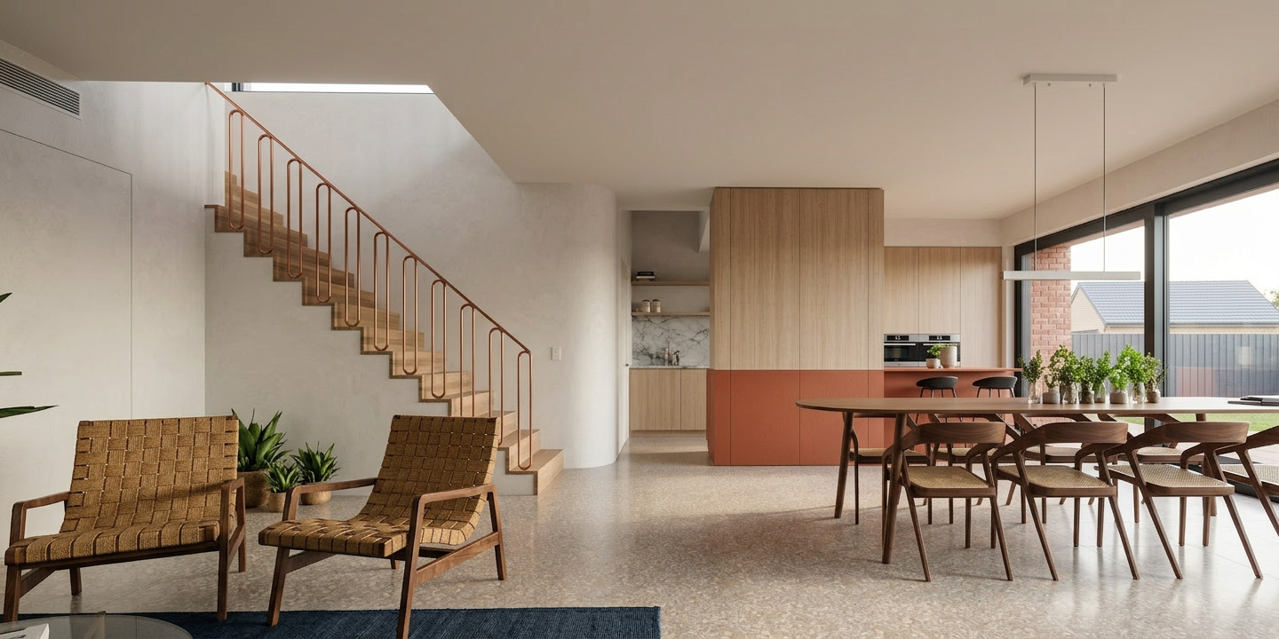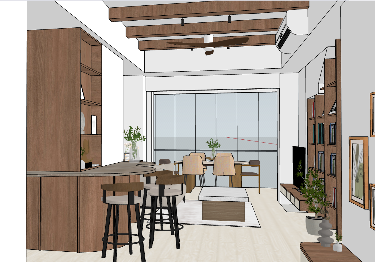create a beautiful rendering of a modern living room with natural and cozy ambiance the space features exposed wooden ceiling beams with a rich walnut brown hue the walls are crisp white providing a fresh and clean backdrop the flooring is a light white oak adding warmth to the room incorporate a large window that lets in natural sunlight casting soft shadows and illuminating the room the furniture includes a set of beige upholstered chairs around a wooden dining table the bar stools are dark brown with soft beige seats a sleek wall mounted air conditioning unit is present the shelves and cabinets have a mix of walnut brown and white finishes holding books and green potted plants add small framed artwork on the wall with subtle earth tones