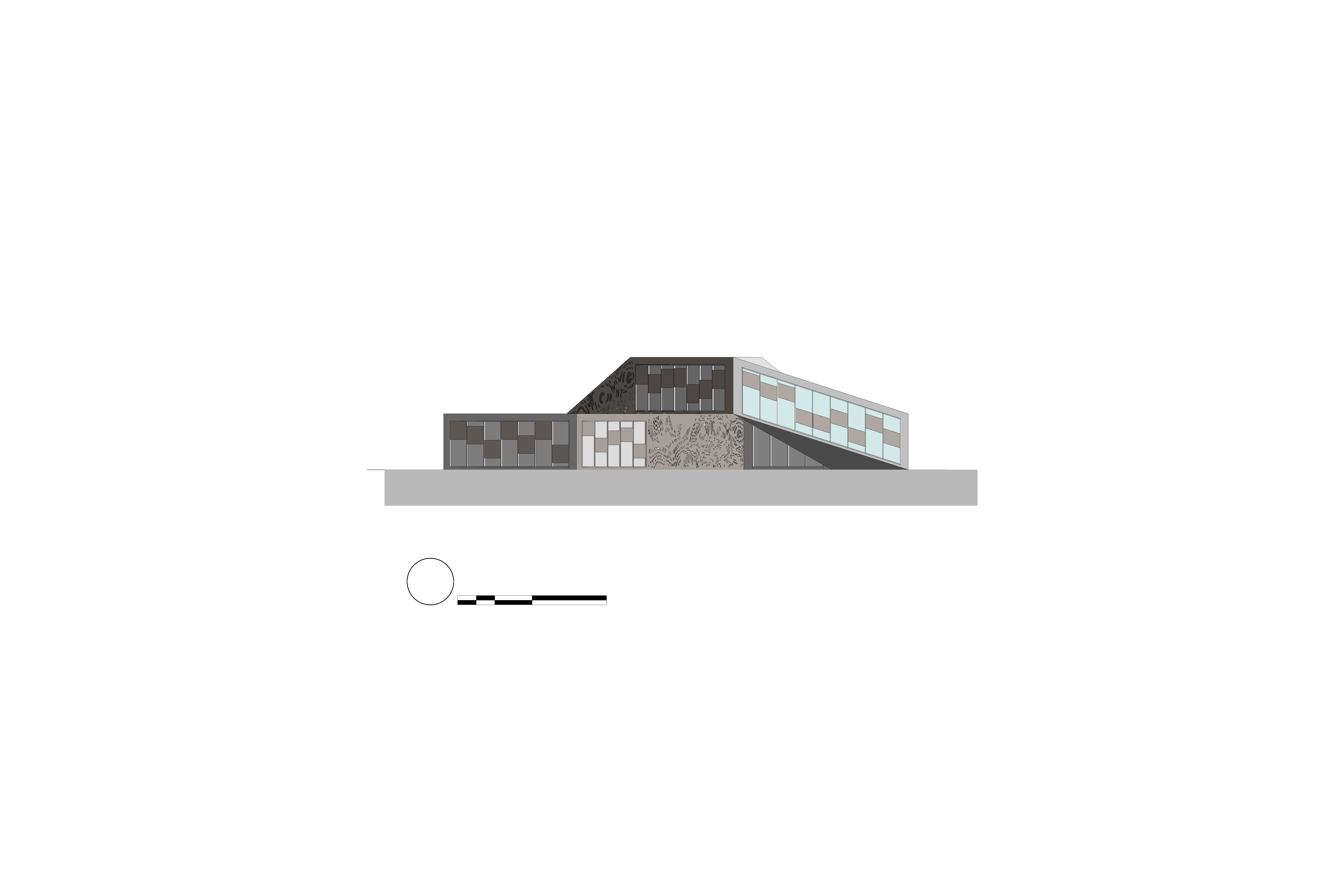 render a modern building with a unique perforated geometric facade featuring silver panels the building is two stories high and has a sleek futuristic design surround the structure with a few tall lush green trees include a calm bright blue sky with soft fluffy white clouds to evoke a peaceful atmosphere place a white car and a cream colored car near the building to add elements of modern urban life use realistic lighting to highlight the intricate details and enhance the overall ambiance