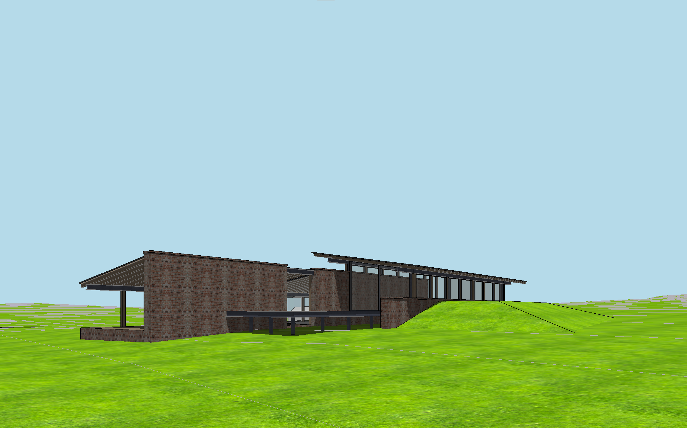 antique brick house with timber columns steel beams glass windows and a standing seam roof wild lousiana grasses and vibrant wildflowers all the way to house yellow pine cypress and other louisiana native trees in the background