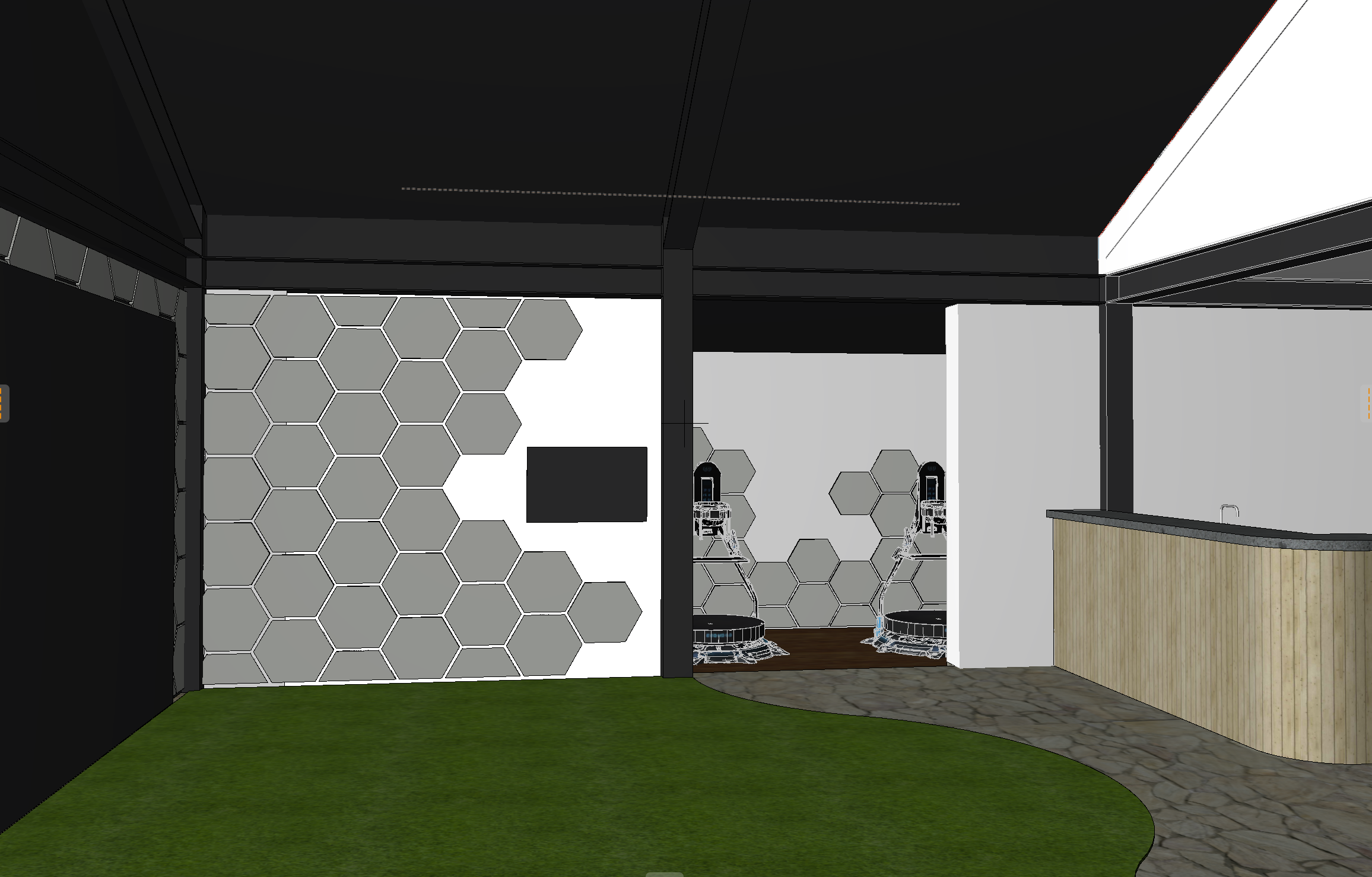 transform this internal view into a realistic render the image shows feature hexagon side panelling with back lighting